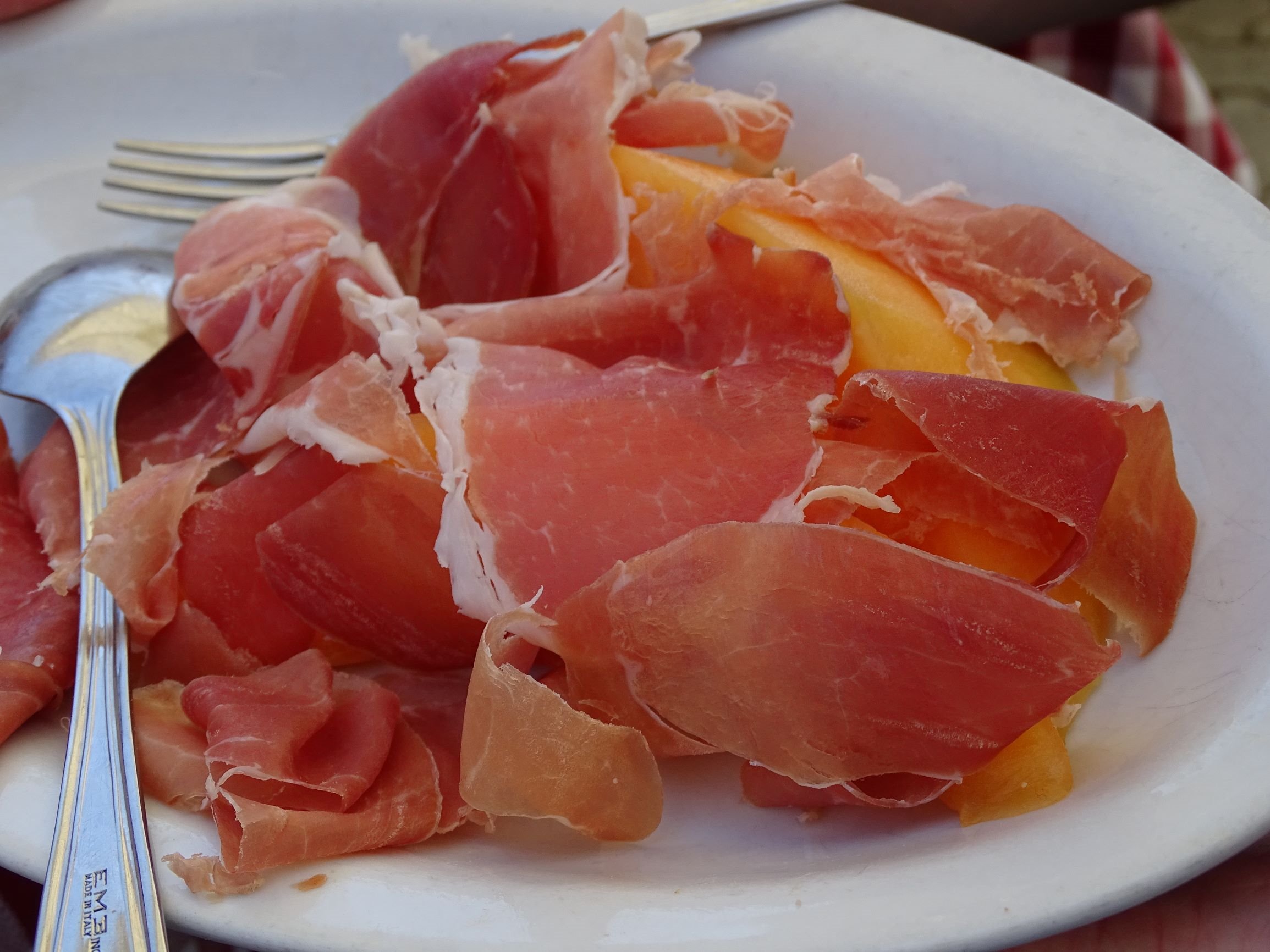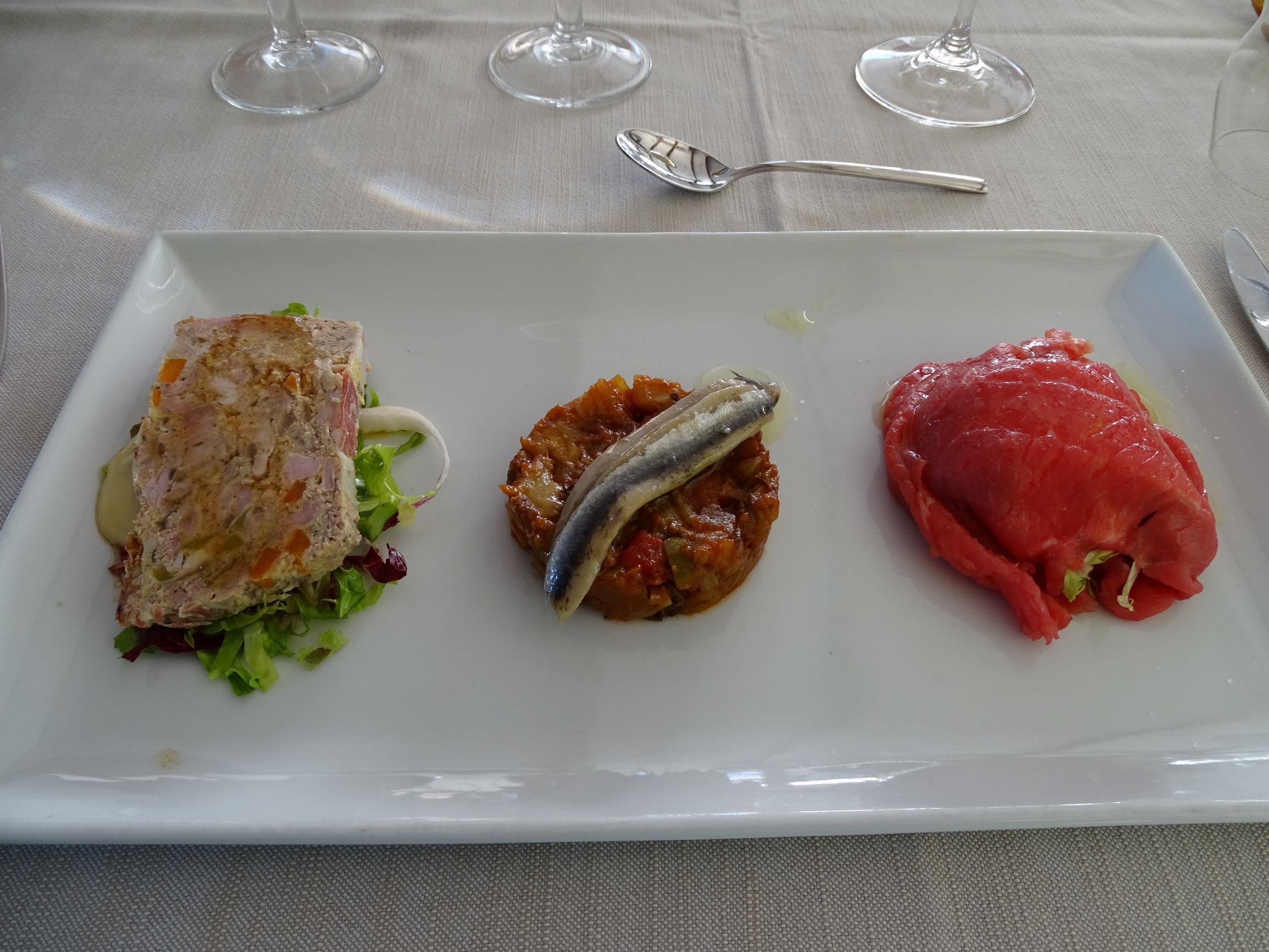 Served slightly chilled as was appropriate for a warm day. Bright, relatively dark red. Raspberries and cranberries on the nose with a hint of citrus. On palate, obviously a step below the Alessandria. Seeming to me a little confected. One of our group summarised it well, I thought, saying “it’s cleaner and tighter but a bit more boring” than the Alessandria. Still, an adequate, inexpensive lunch wine.