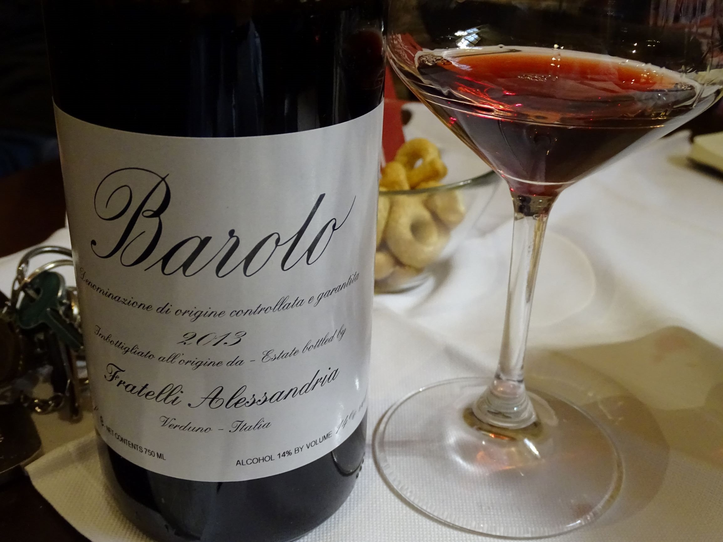 La Terazza da Renza is a great spot, with sweeping views over Serralunga d’Alba vineyards, to enjoy lunch on a sunny day. The food is excellent: simple, honest, typical Piemontese fare. To accompany lunch we chose well with the Fratelli Alessandria Langhe Nebbiolo from the decent wine list … Pale ruby colour. A fruity nose of strawberries, raspberries, cranberries and a little spice. Sweet seeming entry to the palate. Sweetish, gentle tannins but it is bone dry. Refreshing acidity. Delicate, below medium bodied. Flavour profile in the red fruit spectrum with strawberries and tart red cherries prominent. Good at this level. Drink over the next few years.
