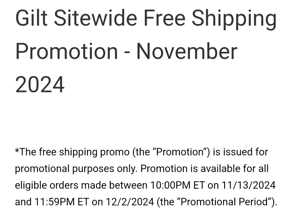 I was offered free shipping from Gilt for 30 days following an initial purchase with paid shipping ($12 to CA) and 10% off as a new customer….