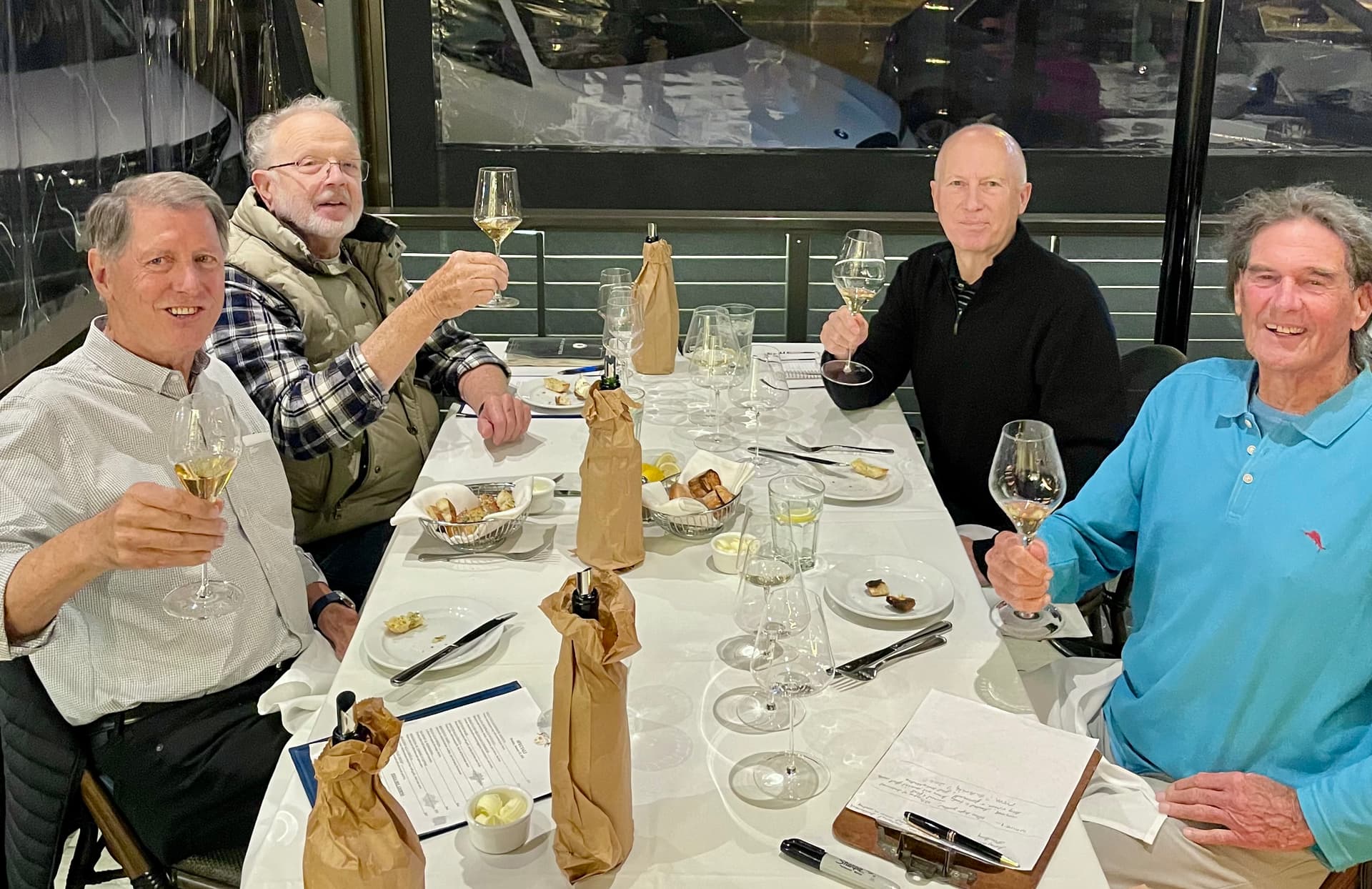 Our Monday Night Blind Wine Dinner Group met once again for another wonderful evening of fellowship, fine dining and wine education. Four of us carried on the ever challenging task of identifying the 4 wines tasted throughout the evening.
