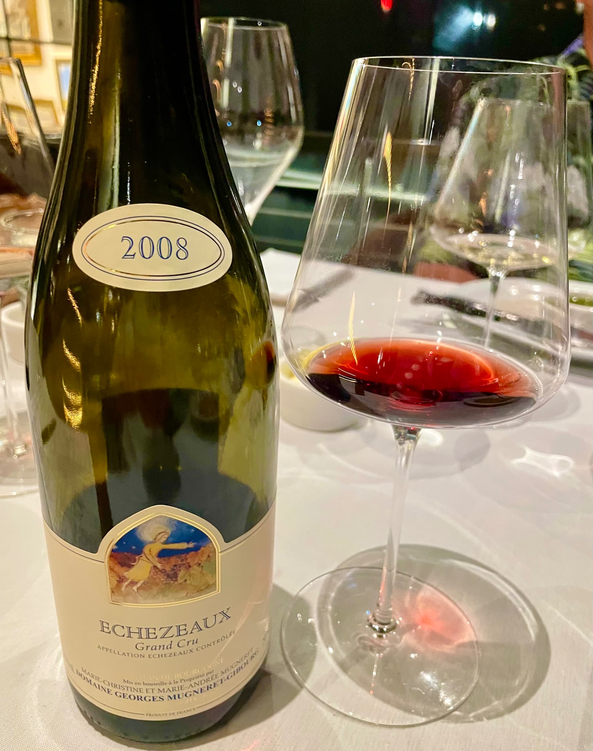 2008 DOMAINE GEORGES MUGNERET-GIBOURG ECHEZEAUX GRAND CRU- blind; following its medium red purple color came mild aromas of spice and pepper laden delicious red cherry which became much more expressed on the palate; although it was on the mellow side, it had enough stuff to impress while maintaining a stately, elegant profile; I had it as a 2005 red Burgundy, thinking it was from Domaine Groffier Les Hauts Chambolle-Musigny as I recalled similar accented red cherry fruit and elegance. The 3 of us did get it a a red Burg.