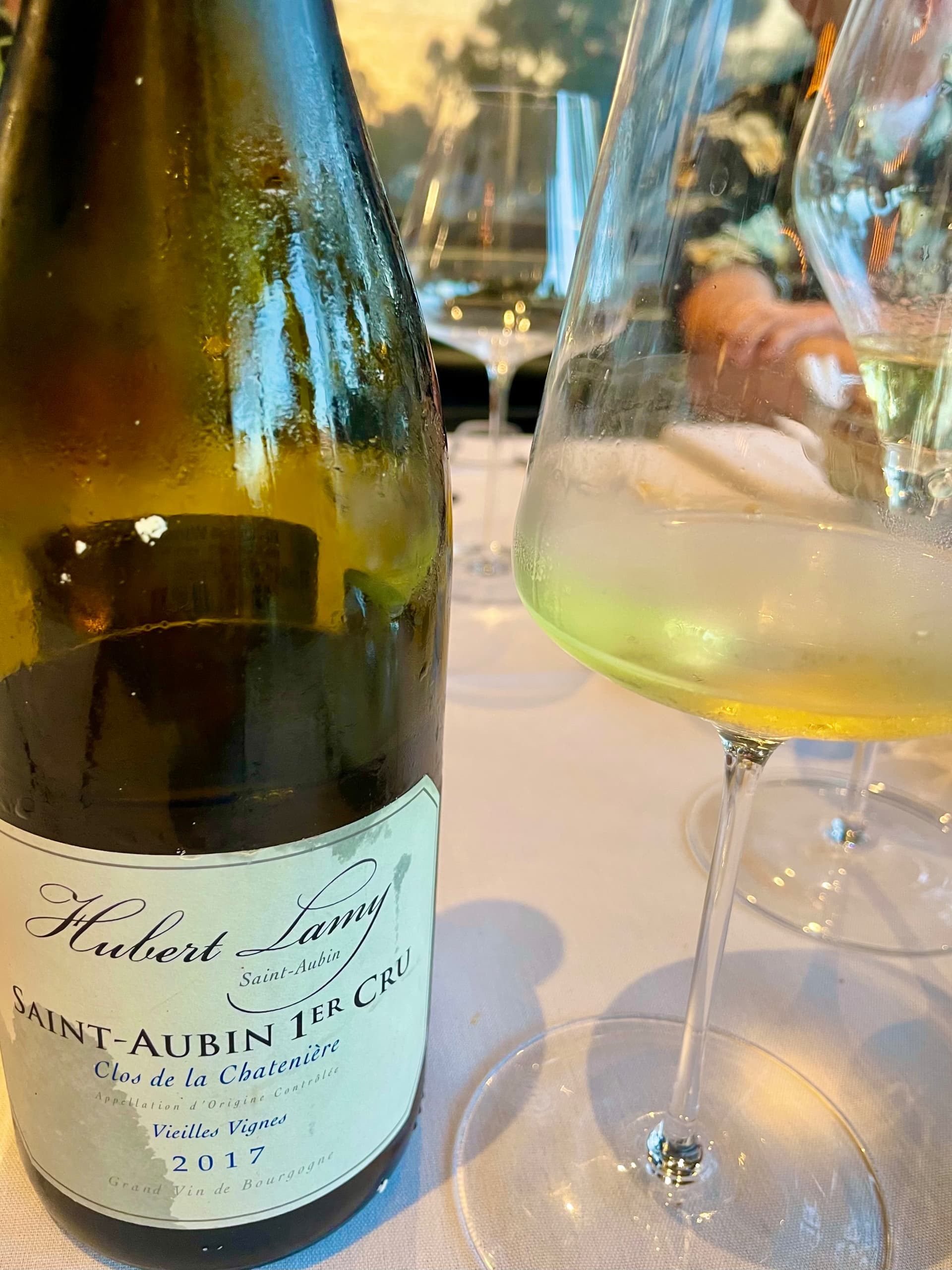 2017 HUBERT LAMY CLOS de le CHATENIERE VIEILLES VIGNES SAINT-AUBIN 1er Cru- blind; years ago, I used to think wines from St. Aubin were inferior to other appellations, but Olivier Lamy and especially Pierre- Yves Colin-Morey has changed that immeasurably in the last few years; this wine was recognized by most as being a white Burgundy and I guessed from 2018, but did not get the appellation; it was so subtle and required going just a bit deeper into the aromatics and tastes to glean its treasures, but they were there and worth the extra effort; the nose included some musty, dusty flint and minerals that complemented the stone fruit that translated especially into yellow apple once tasted; a dollop of lemon zest came in late; it lacked weight and energy, but possessed enough charm and elegance to make for a good experience.