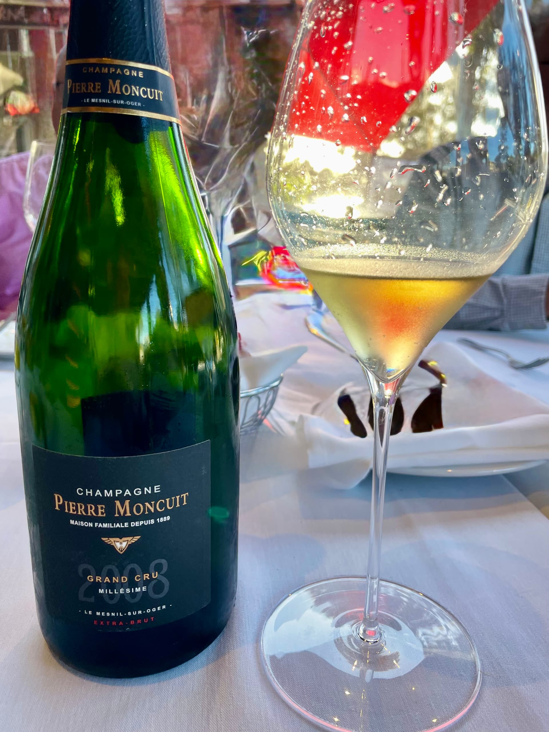 2008 PIERRE MONCUIT BLANC de BLANC EXTRA BRUT GRAND CRU- served blind to the others; they immediately picked up on the oxidative notes that prevailed in the nose and taste profile although the color was more yellow than gold which suggested to me, although I did not find any information to sup[port this, the producer may have a tendency to give his wines more air, but then again, the vintage was so replete with big and powerful wines, more air would not really be needed; caramel and tangy butterscotch were the first notes that suggested such with tangerine, Meyer lemon, yellow apple, mango and a coat of honey and streak of minerals coming in on the palate; the aromatics were very intense and I had to back off and come in more gently after the first hit; the wine had bracing acidity, depth and loads of energy and provided an aggressive yet fun and interesting experience in this Extra Brut disgorged 11/20 and dosed at 3 gpl. One of the others had it as a 2000 and most had it as a BdB.