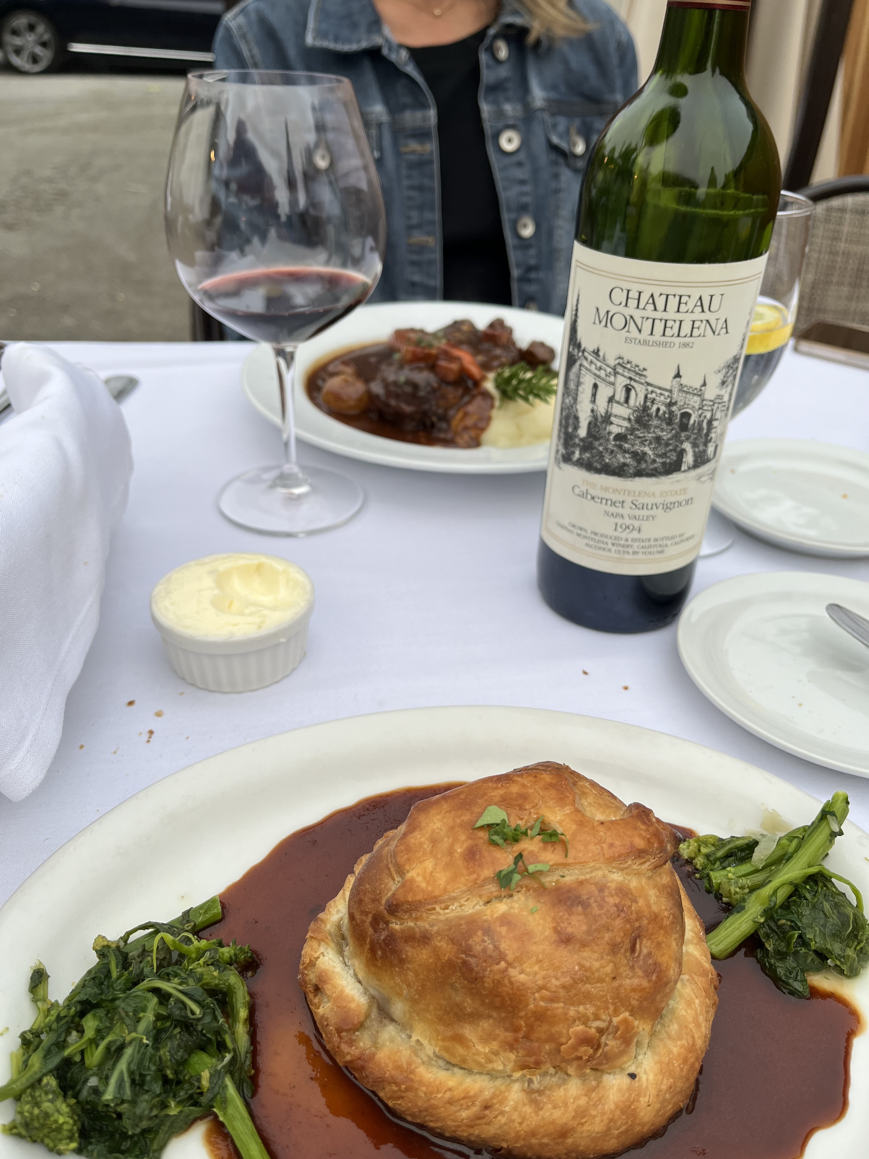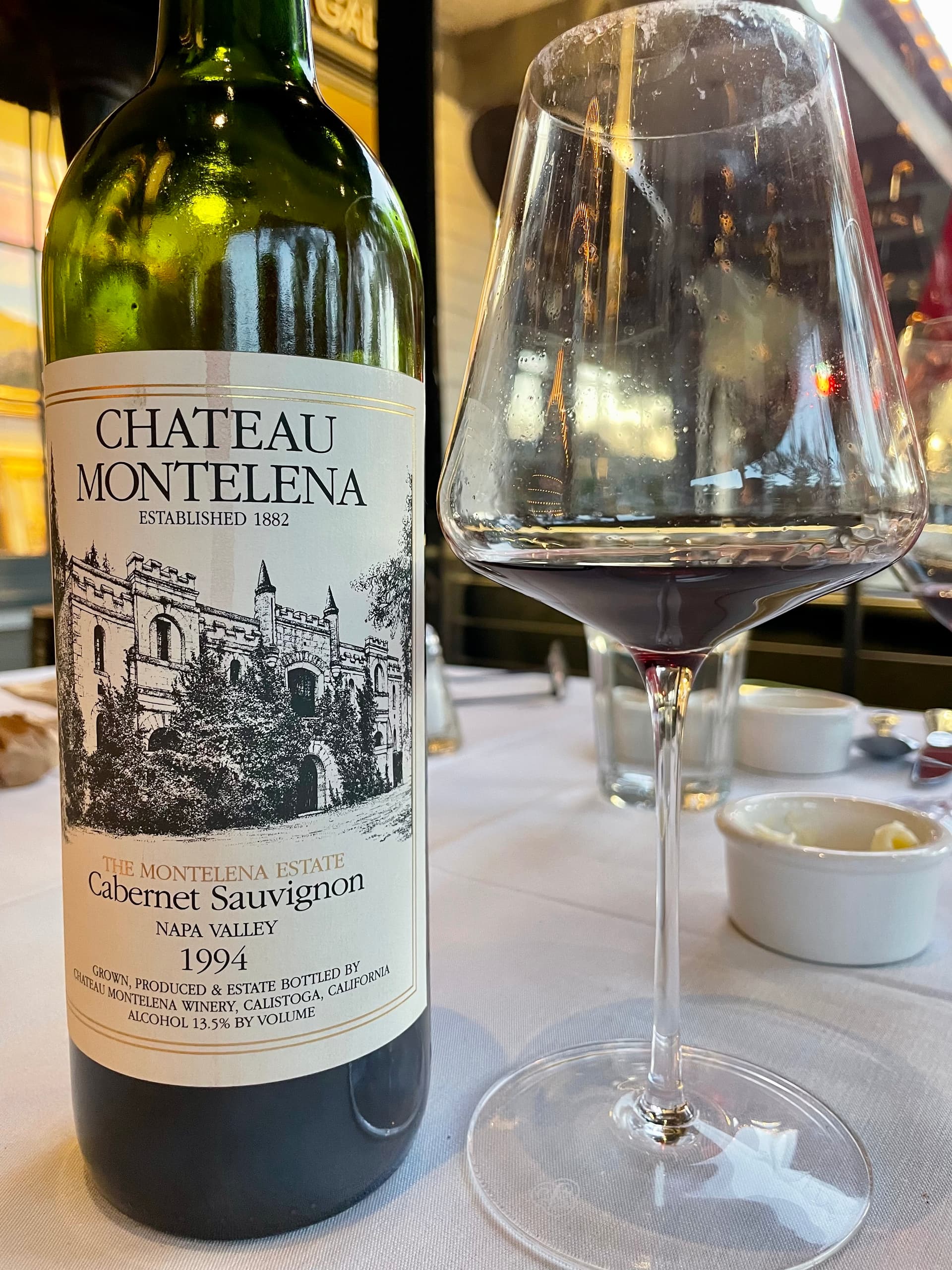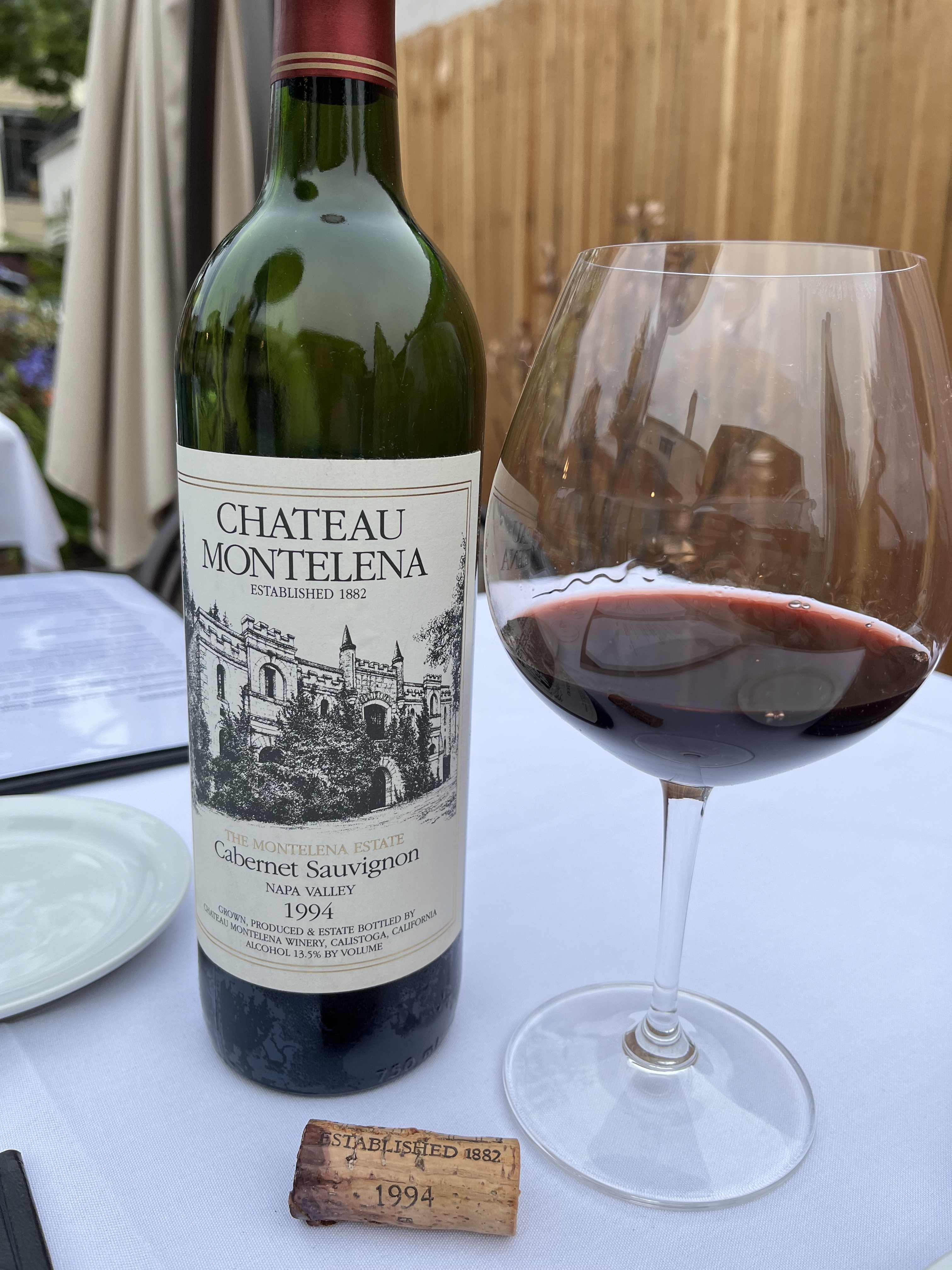 1994 CHATEAU MONTELENA CABERNET SAUVIGNON NAPA VALLEY- blind; this had just bit more color and seemed bigger, more intense and more complex than the first wine {1982 L’Eglise Clinet} as well as being more balanced with everything integrated and in order; it was super smooth, fully loaded, full bodied with layered complexity and finished with a climactic conclusion with everything coming together perfectly; I got cedar and talc accented red and black currant and started thinking this is a Cabernet Blend, but never convinced myself enough to move away from Burgundy. Regardless, this was absolutely fabulous and one of the best wines I’ve had in a while.