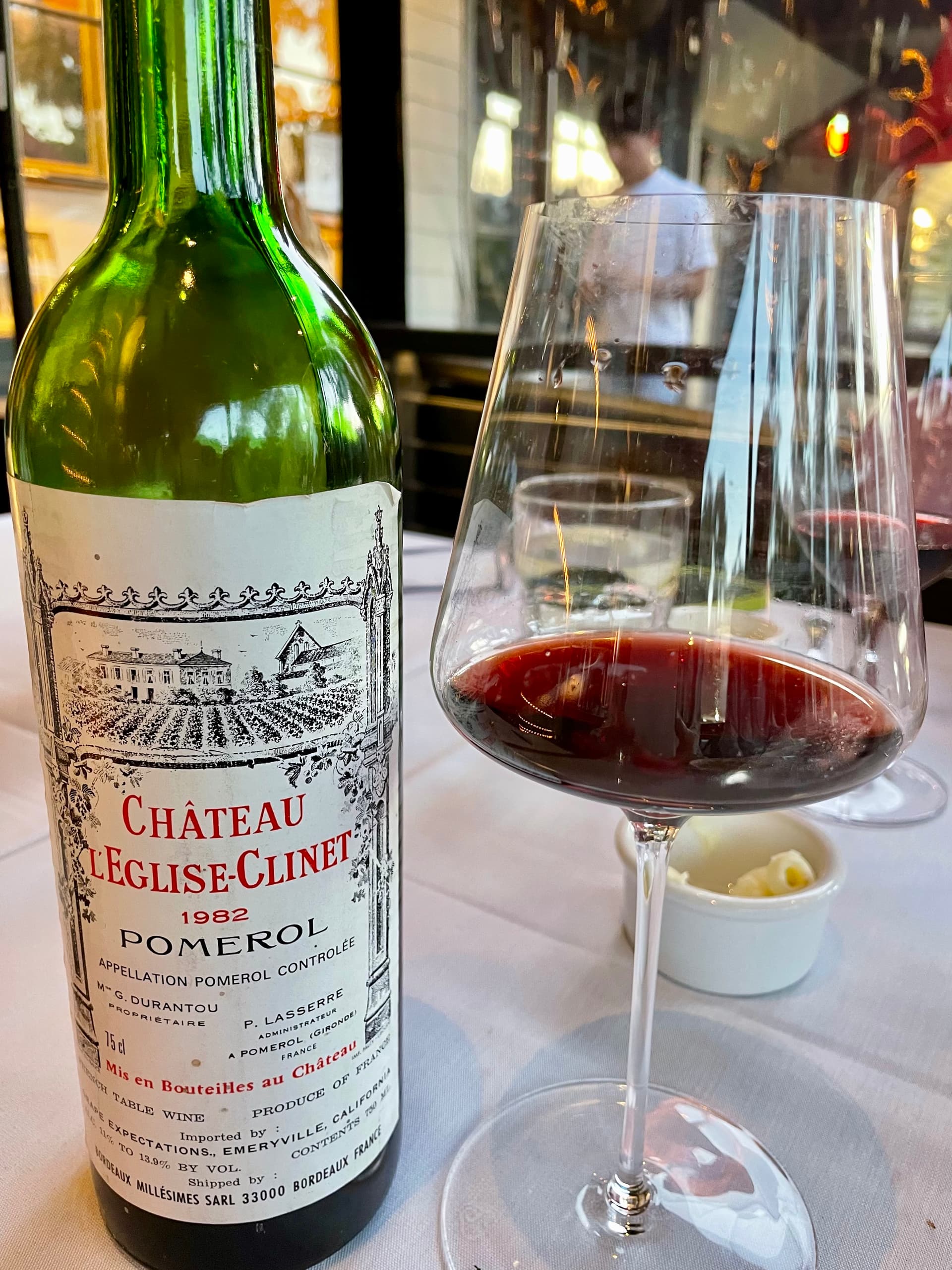 1982 CHATEAU L’EGLISE CLINET POMEROL- blind; 80% Merlot, 20% Cabernet Franc; opened and poured at the table; the color was a medium dark red purple with a bit of bricking and the nose offered burnt dark red cherry notes with spice and talc in the background which continued on once tasted with more red and black cherry fruit showing up; the burnt toast accent and fruit profile suggested red Burgundy to me; it was definitely fruit forward and seemingly needing more time to balance out although it was a real treat at this stage; I was all over the place with the vintage too, first thinking this might be from the early 2000s, but the bricking and mature fruit said it was older and I eventuality called it 1982 once hearing the other 2 pronouncing it was Bordeaux. Loved it.