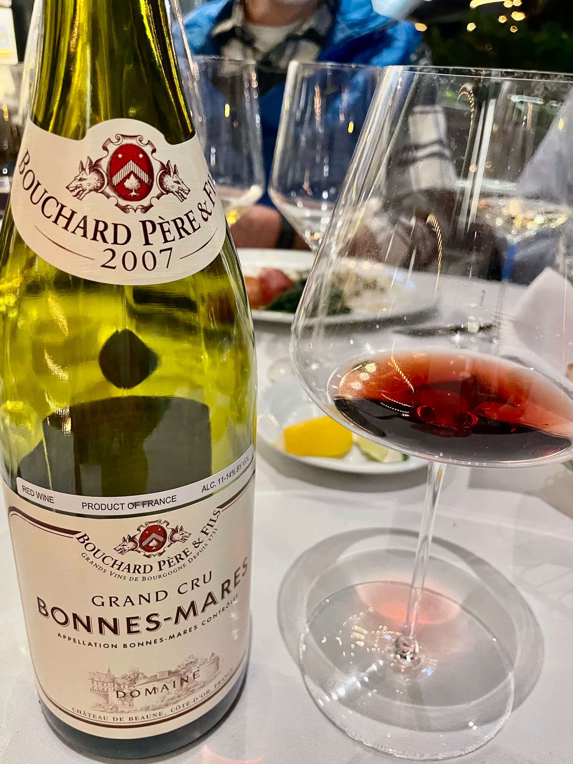 2007 BOUCHARD PERE et FILS BONNES-MARES GRAND CRU- blind; the dark red purple color was followed by aromas of talc, cola and spice accented red raspberry which continued on all the way to the back end while being carried in a viscous texture that had some weight; it was full bodied with depth and yet had loads of grace an charm; there was no doubt this was Burgundy and a superlative one at that. Most others agreed and we had it as being 15-20 years old; I guessed it to be Echezeaux.
