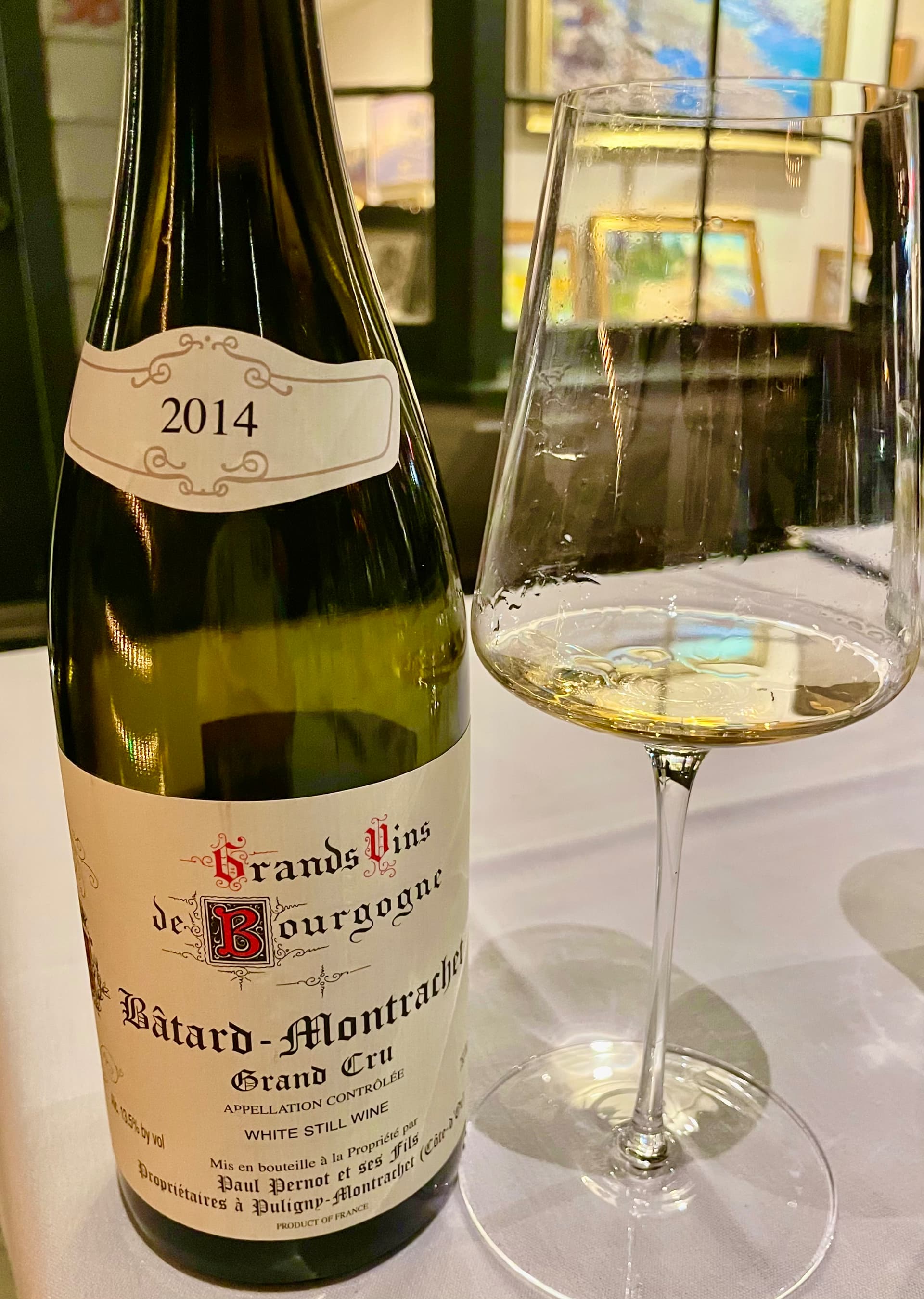 2014 DOMAINE PAUL PERNOT BATARD-MONTRACHET GRAND CRU- blind; the color was a deceiving gold brown bronze suggesting this was oxidized and either premixed or had some age on it and I incorrectly went with the latter as the nose and taste profiles were replete with caramel, butterscotch and hazelnut accented yellow peach and apricot fruit; there was some yeasty character and as another stated, mustard greens like notes that prevailed throughout; the texture was a feel good, honey like creamy; unlike most wines, this did not change over time and expressed the same characteristics for over a 1 1/2 hours; I had it as an old new world Chardonnay from Napa; one of the others eventually got to Batard.