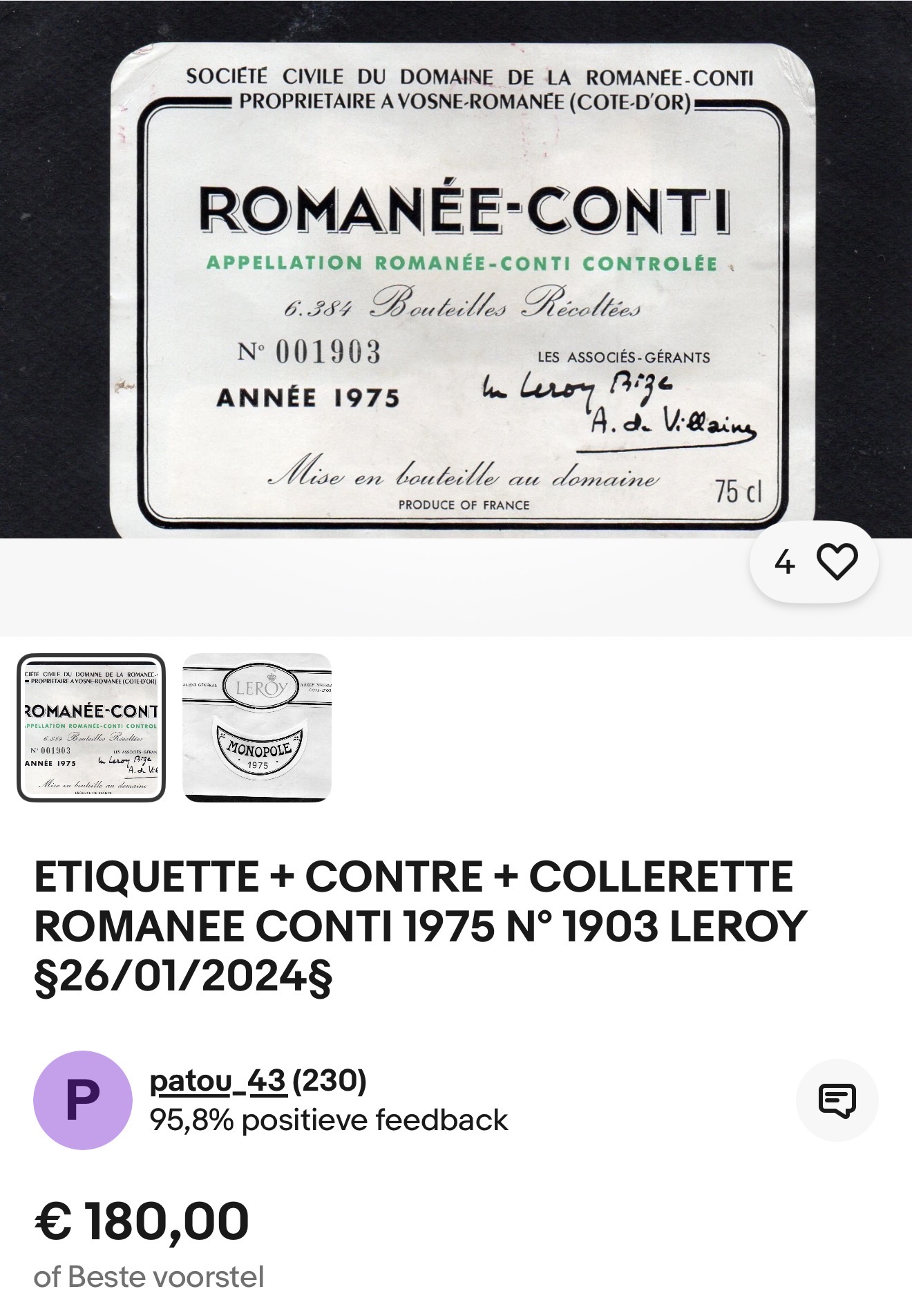 Hi everyone, new here. Not fairly new to wine but new to upper high class wine (coming from collecting Margaux etc) and looking for some advise. I’m offered to buy a DRC 1975 at a reasonable price. I have been searching the internet all over (incl this forum) to find info about counterfeits etc. The pics I have seems quite good. Only the necklabel is missing (but so do they on a lot of pics around the internet), the rest seems in order. At least to me. I have been in contact with DRC and they say they don’t see anything strange but of course cannot guarantee from a pic that its genuine. The only thing odd is the color of the glass but I also have read that genuine bottles can have different colors glass. Maybe someone here can say some smart things about it?