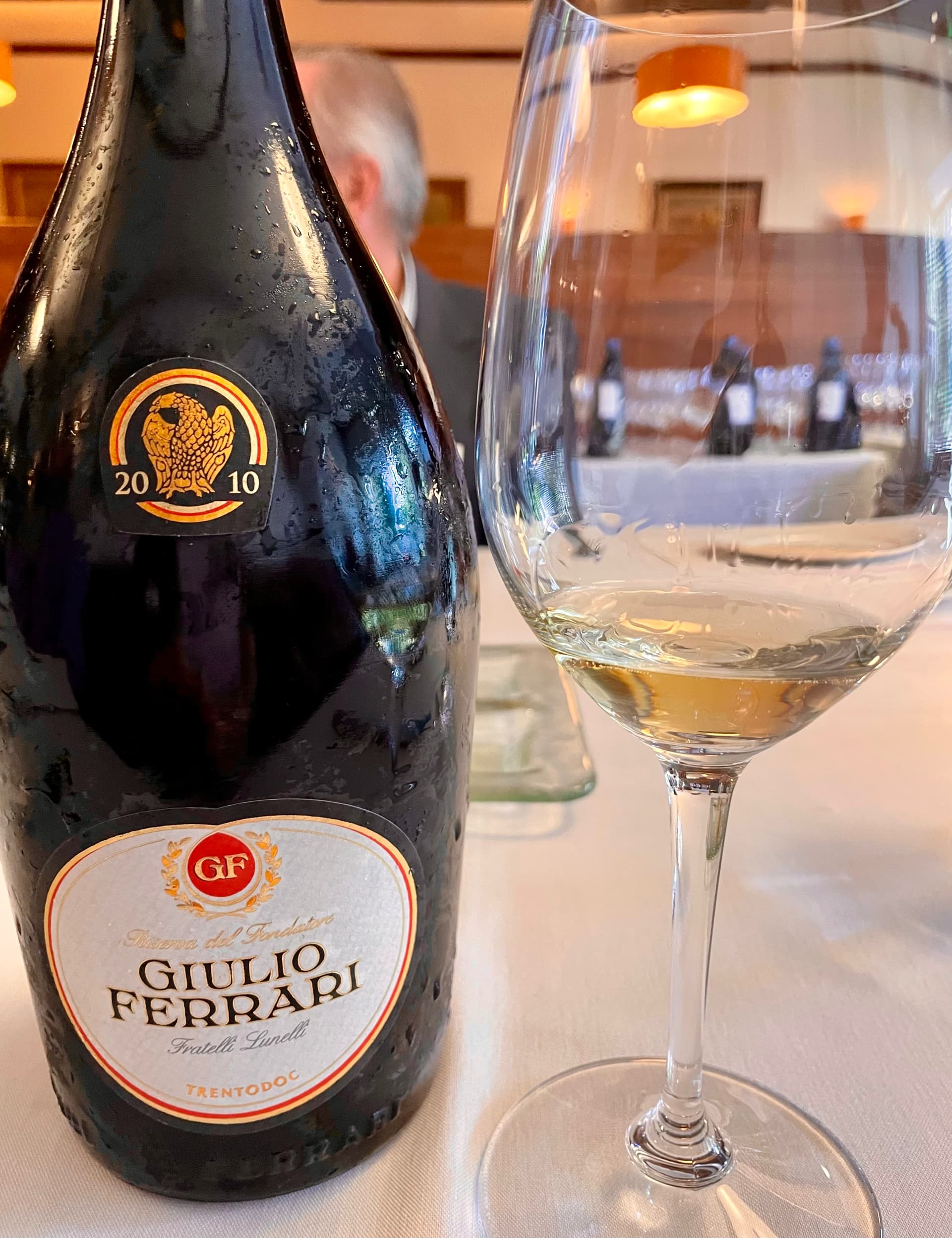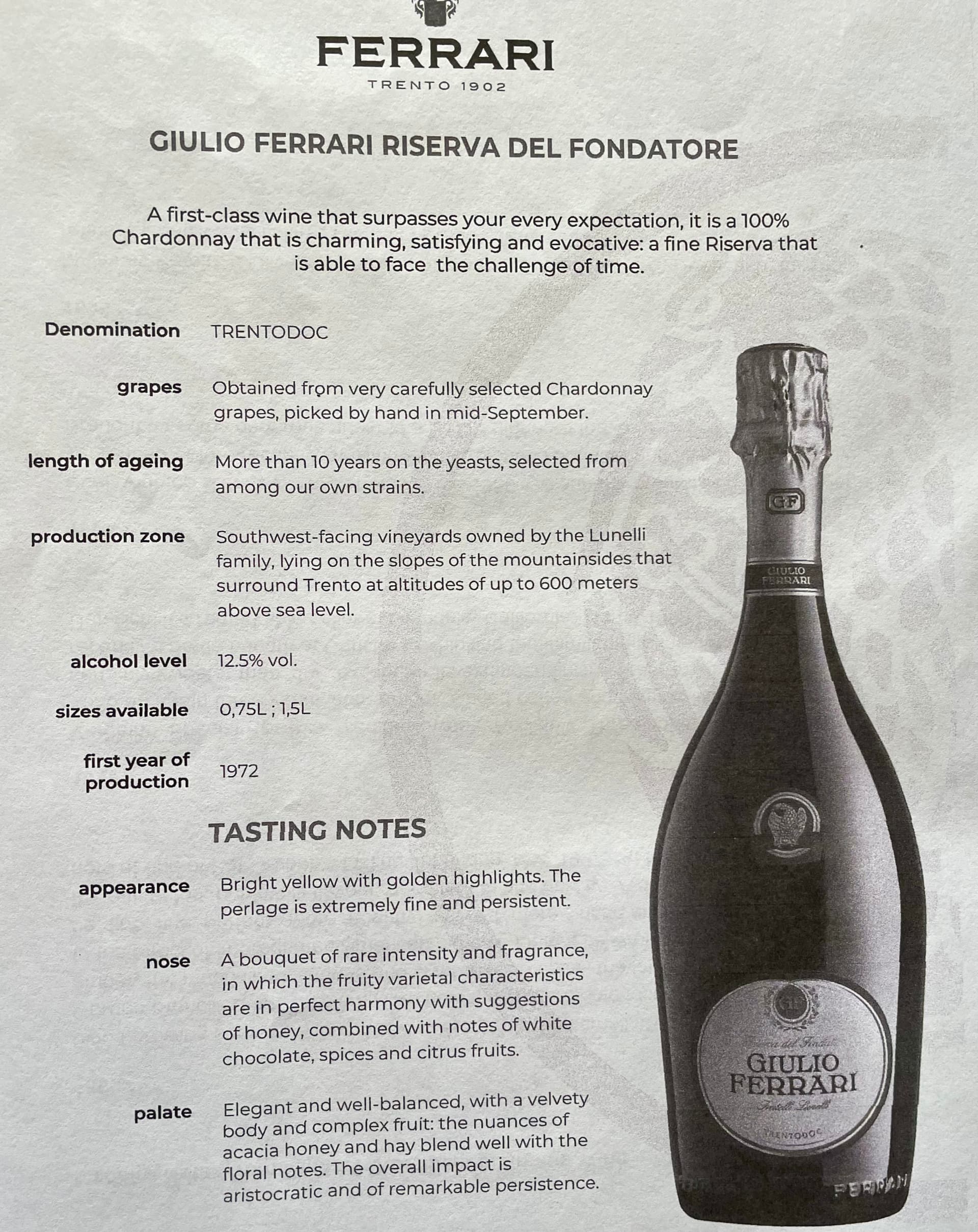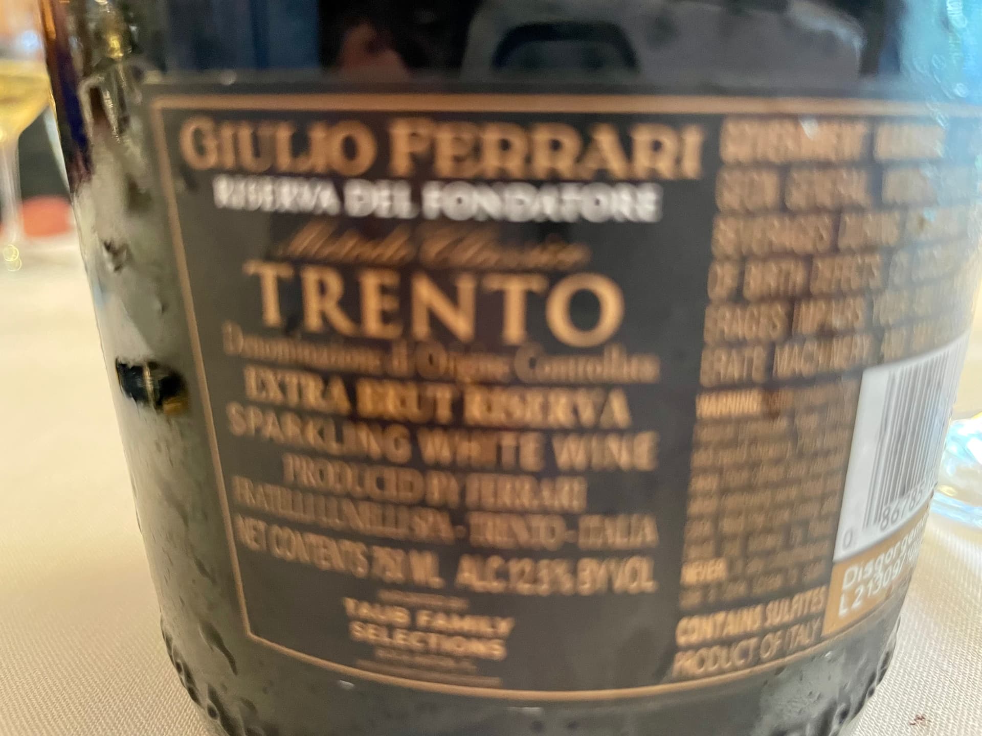 2010 GUILIO FERRARI RISERVA del FONDATORE EXTRA BRUT SPARKLING WINE TRENTINO- served from a 750 ml bottle blind; the guesses as to which producer this came from were all French and included my guess, Piper Heidsieck Rare, Gosset and Ruinart; regardless, the color was light yellow toward gold, that deceived me into thinking this was a mellow and charming bubbly, but the nose had a huge blast of acid that was even bigger once tasted and only because my palate relaxed and acclimated a little was I able to discern much more; I got some serious hazelnut accented lemon/ orange extract with a little yellow apple in this rich and full bodied marvel along with a mildly stinging mouthfeel; it was interesting, mysterious and actually decent after the 3rd glass- kidding re the latter. I liked it.