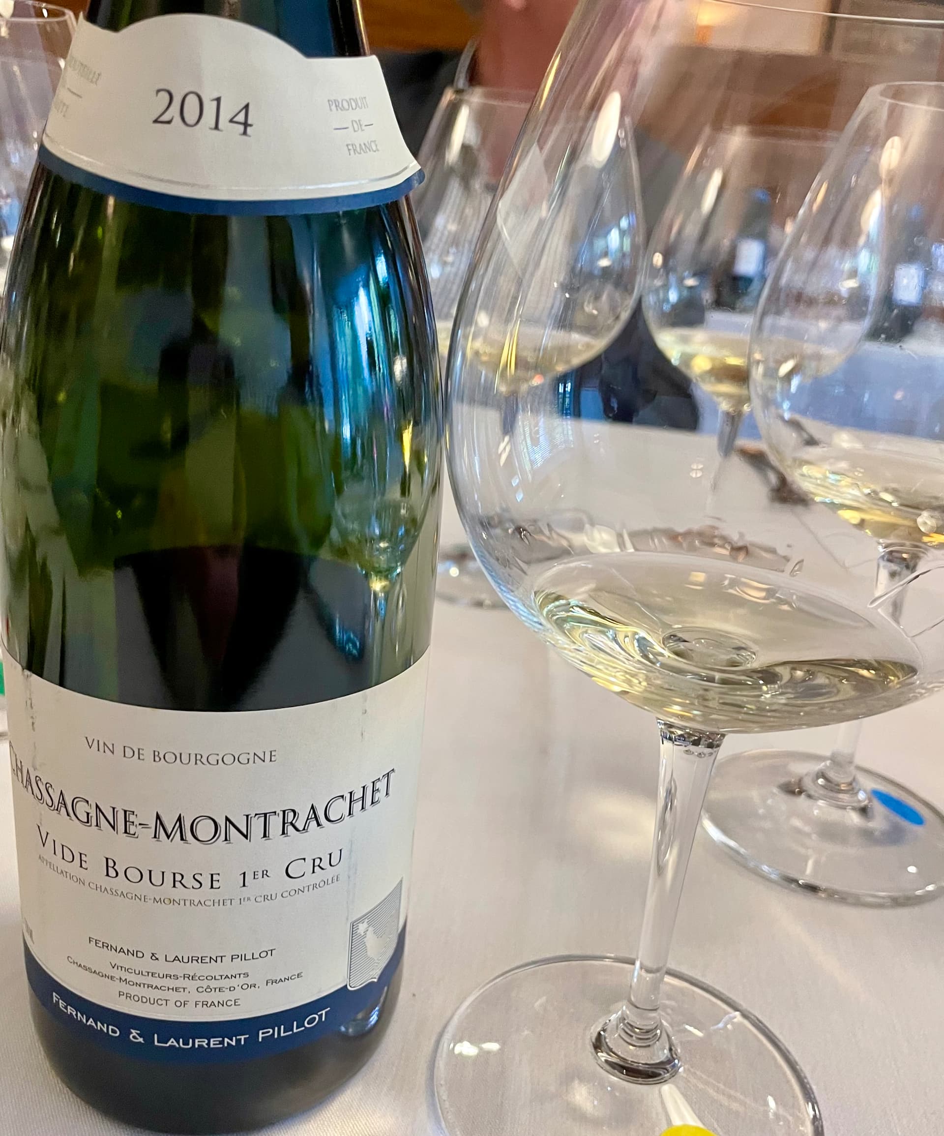 2014 FERNAND & LAURENT PILLOT VIDE BOURSE CHASSAGNE-MONTRACHET 1er Cru- blind; light yellow color; the nose was somewhat muted, but the taste pleased immensely with grandmother’s best lemon meringue pie like profile and the soft chiffon like texture complimented it perfectly; this was so flavorful, simply a delicious wine that is very approachable now.