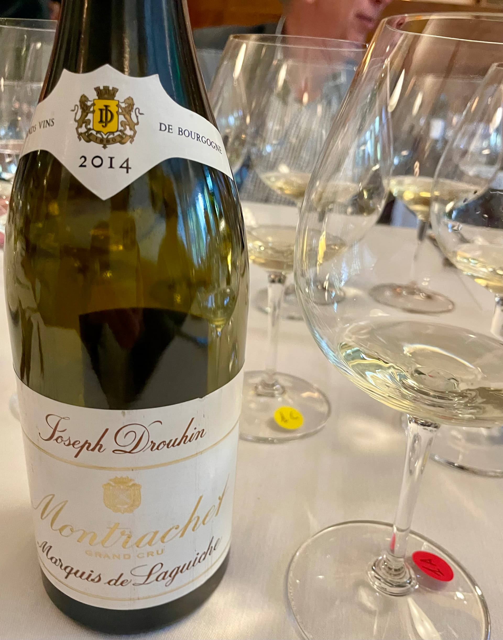 2014 JOSEPH DROUHIN MARQUIS de LAGUICHE MONTRACHET GRAND CRU- blind; light yellow color; the nose had some fairly intense buttered popcorn, flint, minerals and matchstick that provided accents to the honeyed yellow apple, lemon oil and white peach fruit; it was rich, full bodied and long and as such, was my fav of the flight.