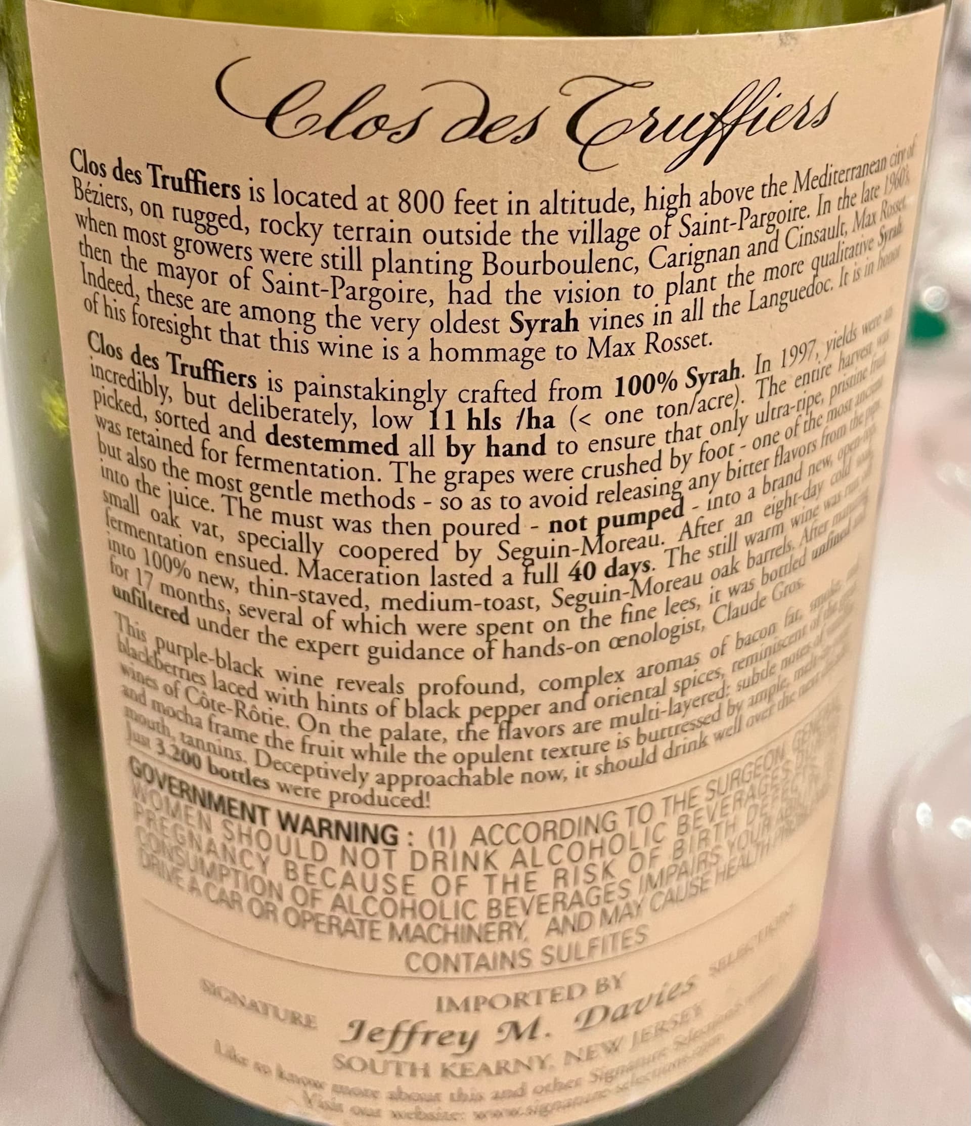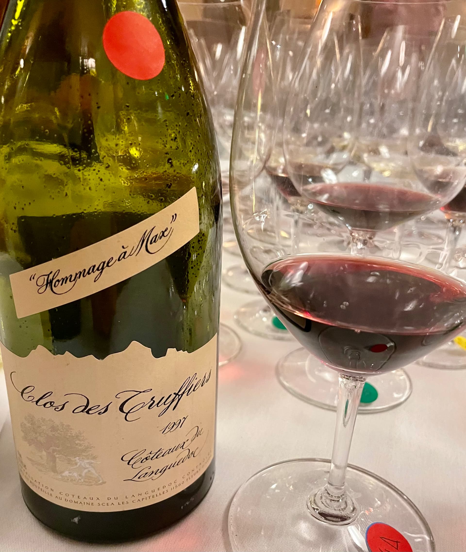 1997 CHATEAU de la NEGLY CLOS des TRUFFIERE ‘HOMAGE au MAX’ COTEAUX du LANGUEDOC- blind; 100% Syrah fermented in 100% new oak for 17 months; Clos de Truffiers (which could be loosely translated as “field of the truffle hunters”) is a second label made by the family domaine called Chateau de la Negly; it had an intense dark red purple color; the nose had a metallic component that did not dissipate, but some nice minerality served to soften it; the taste profile was replete with black currant, blackberry and blueberry and I’m thinking Bordeaux- Ha; perhaps the wild fruit notes should have steered me away from Bordeaux, nonetheless, I loved this wine and called it fabulous.