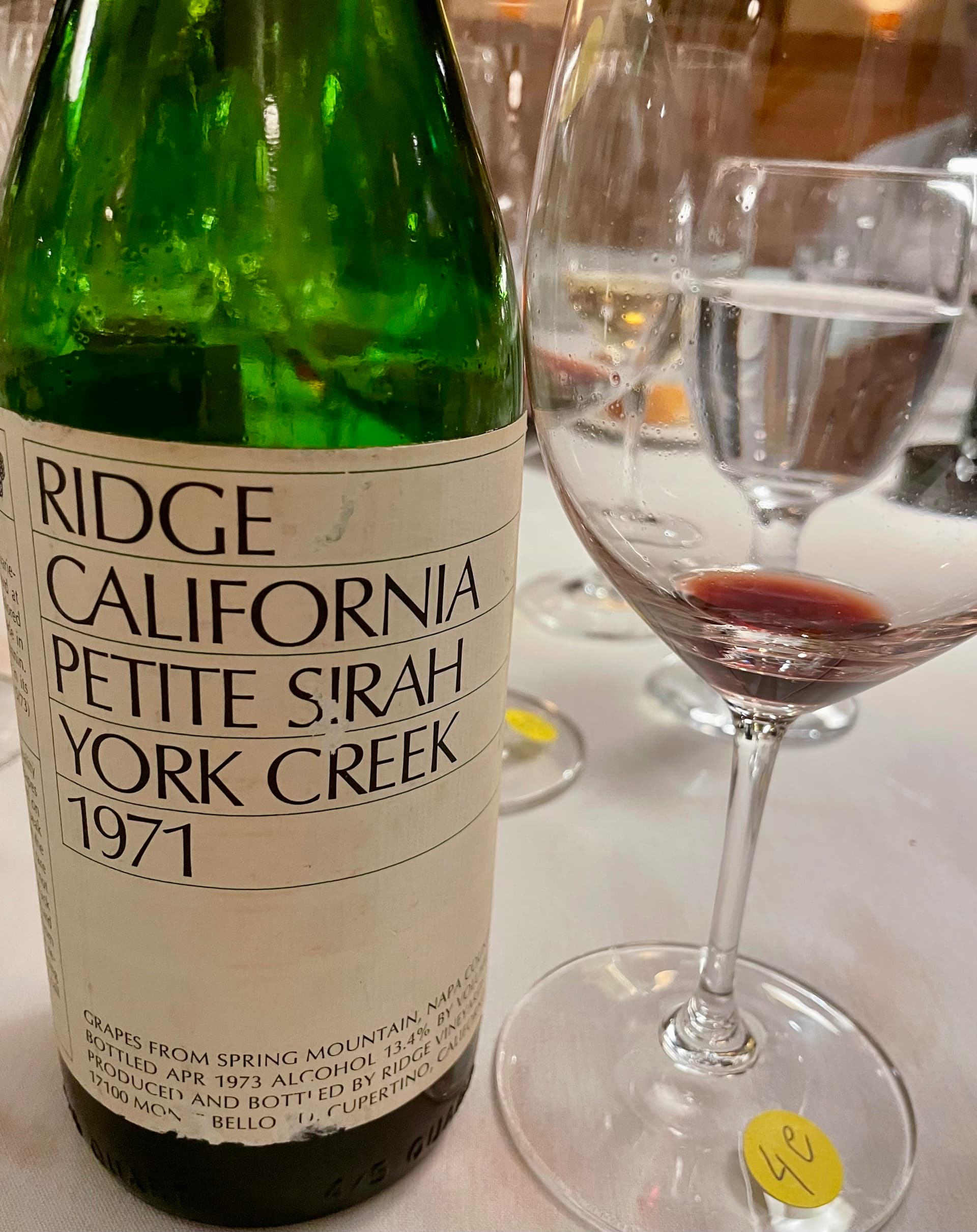 1971 RIDGE VINEYARDS YORK CREEK VINEYARD PETIT SIRAH NAPA- blind; no way do I get PS in this, but, as always, it seemed reasonable after it was revealed; this one has shed its dark, inky, super serious tannic cloak in favor of a being a touch more mellow although the dark fruit had a wild and woolly component to it and it still had lots of body, depth and complexity while maintaining an amazing balance; I found it even more amazing that it was over 50 years old and still sporting an amazing fruit profile that was sourced from Spring Mountain prior to it being established as an AVA.