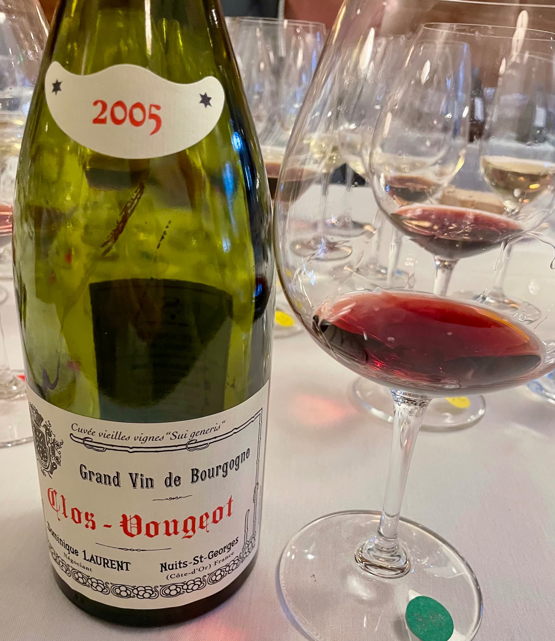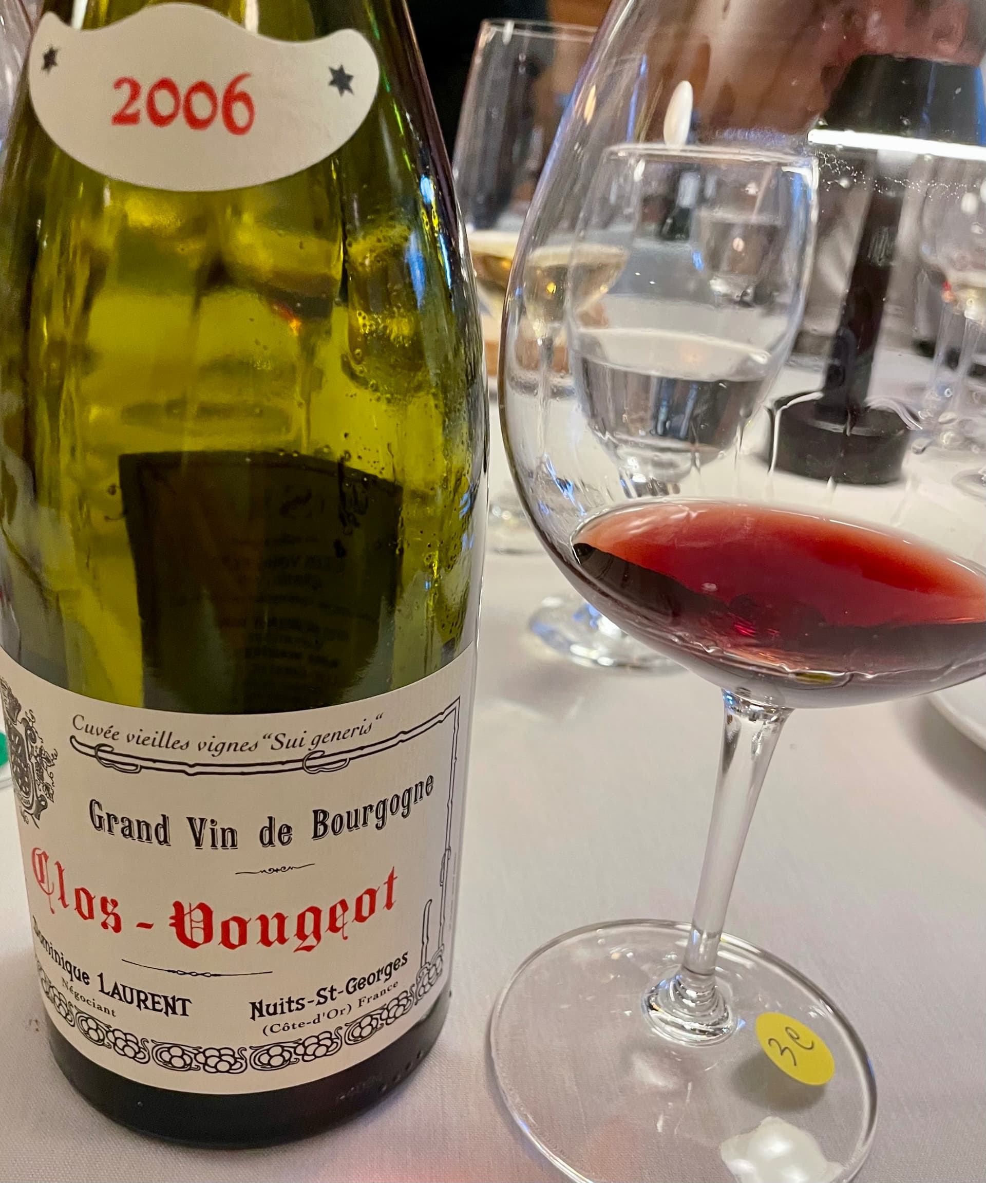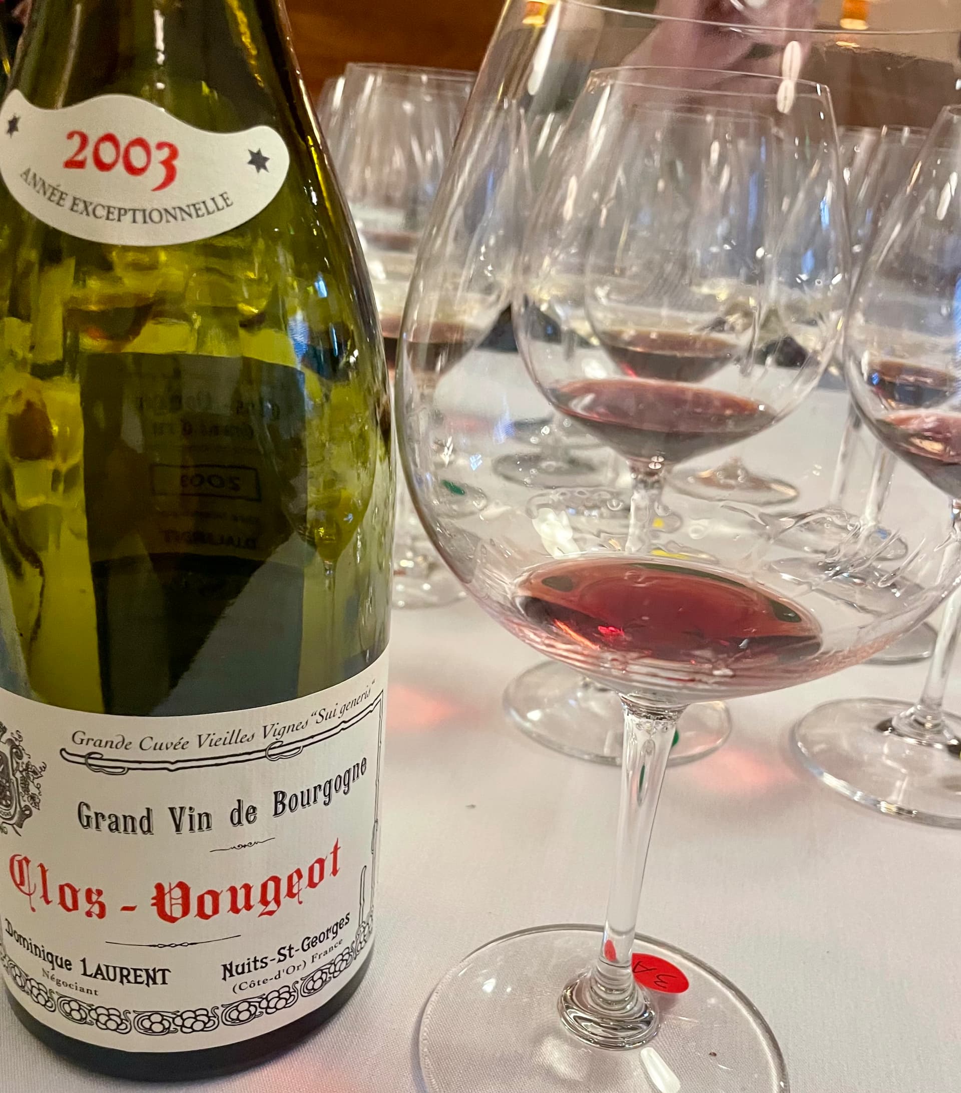 2003 DOMINIQUE LAURENT CLOS-VOUGEOT VIEILLES VIGNES GRAND CRU- blind; the color was a somewhat youthful dark red purple, but the nose suggested it was more mature with dried cranberry cherry fruit accented with a bud of clove; on the palate, there was a wild character in the fruit and along with the dried cranberry, I’m not even close to Burgundy unless one calls Southern Rhone close.