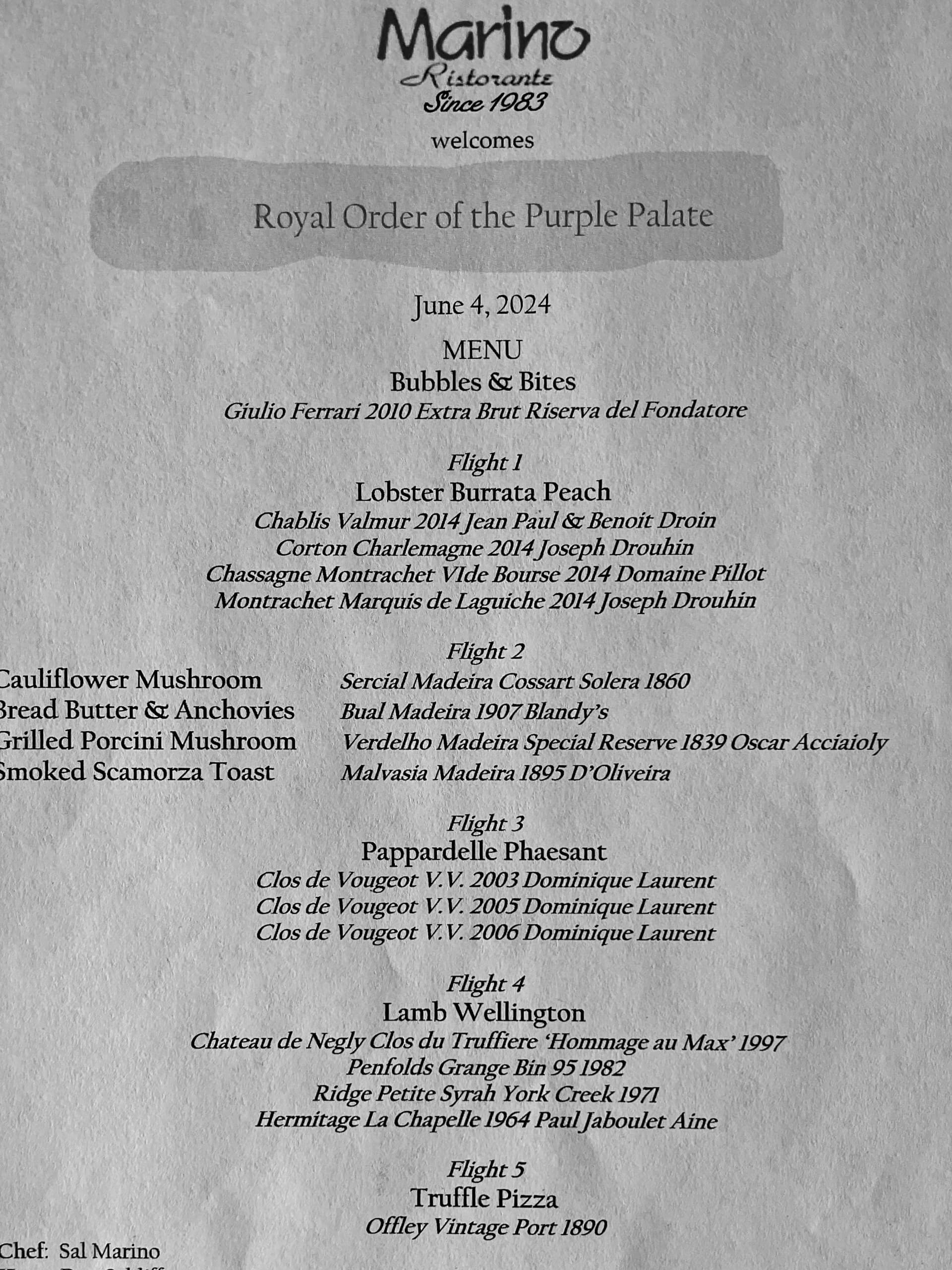 Additionally, and concurrently, there was a dinner group formed consisting of top wine collectors/ industry people who have met at varying times over the decades and currently once a month with one of the members being responsible for the wines and dinner. They call themselves the Royal Order of Purple Palate, ROPP. A good friend is one of those current members and his turn to host just came up this year.