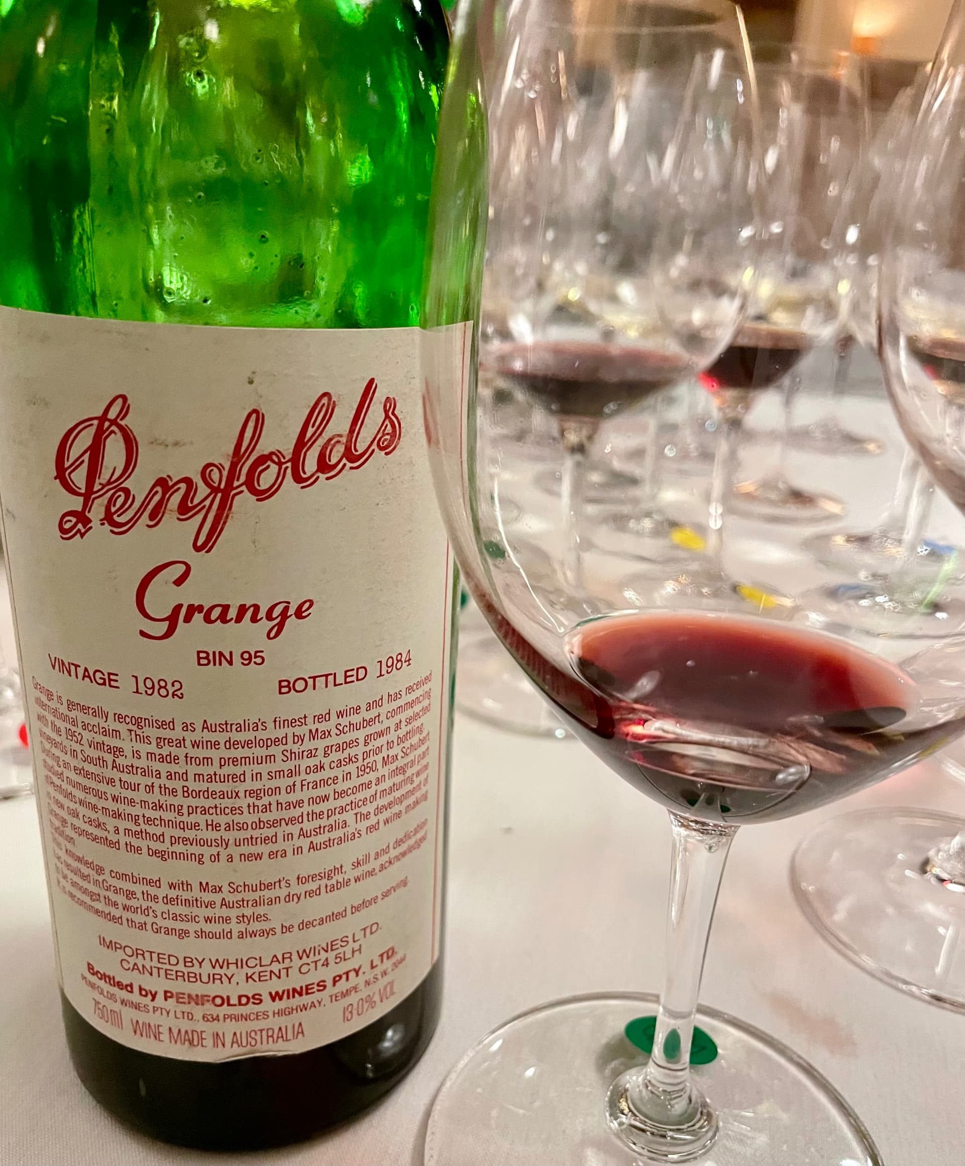 1982 PENFOLDS GRANGE BIN 95 SHIRAZ SOUTH AUSTRALIA- blind; 94% Shiraz, 6% Cabernet Sauvignon aged in new American oak hogsheads for 18 months; 13.5% abv; following its intense dark red purple color came aromas of mint, eucalyptus and pepper accented ripe blackberry and black cherry, all of which continued on to the back end; it was full bodied with some weight, had some power but more finesse and charm and as such, was a wonderful experience that seemed to grow and expand over time; loved this one too. In retrospect, I could have made a case for this being an Unico.