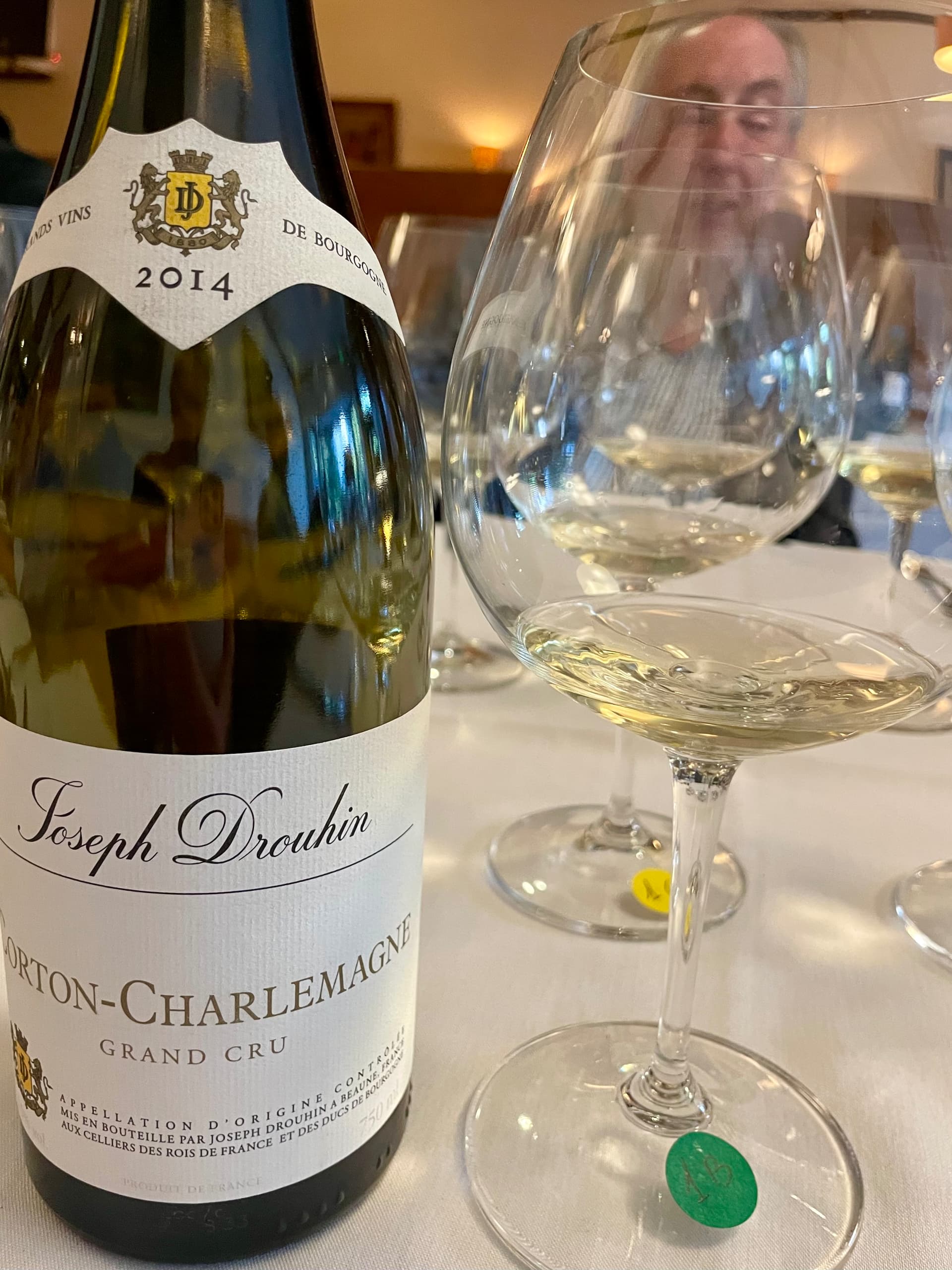 2014 JOSEPH DROUHIN CORTON-CHARLEMAGNE GRAND DRU- blind; light yellow color; initially, before blowing off, the nose was redolent of burnt matchstick that almost overwhelmed the underlying citrus and orchard fruit notes that translated into lemon and yellow apple in this lovely, balanced, soft, smooth and round beauty.