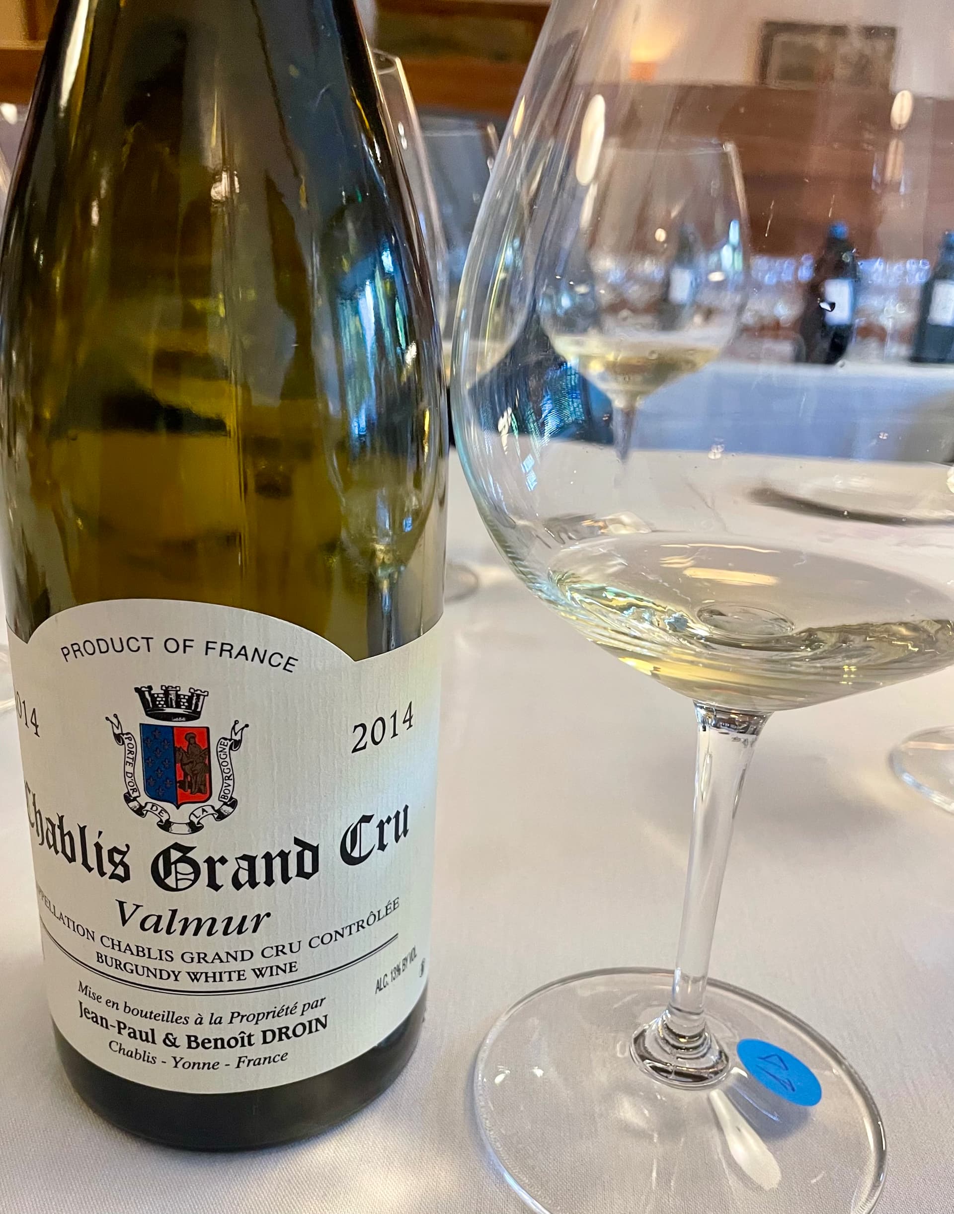 2014 JEAN PAUL & BENOIT DROIN VALMUR GRAND CRU CHABLIS- blind; light yellow color {as all 4 were}; it seemed just a bit warm, but the flavors were not all that enhanced; following mild aromas of flint and minerals, came a nice breath of citrus with lemon most evident and a touch of saline; once tasted, some nice yellow apple joined in; it was medium bodied and delivered softly to the back end where a hint of oyster shells showed up, perhaps in retrospect, from the Kimmeridgian soil that graces this region or did I just imagine it?