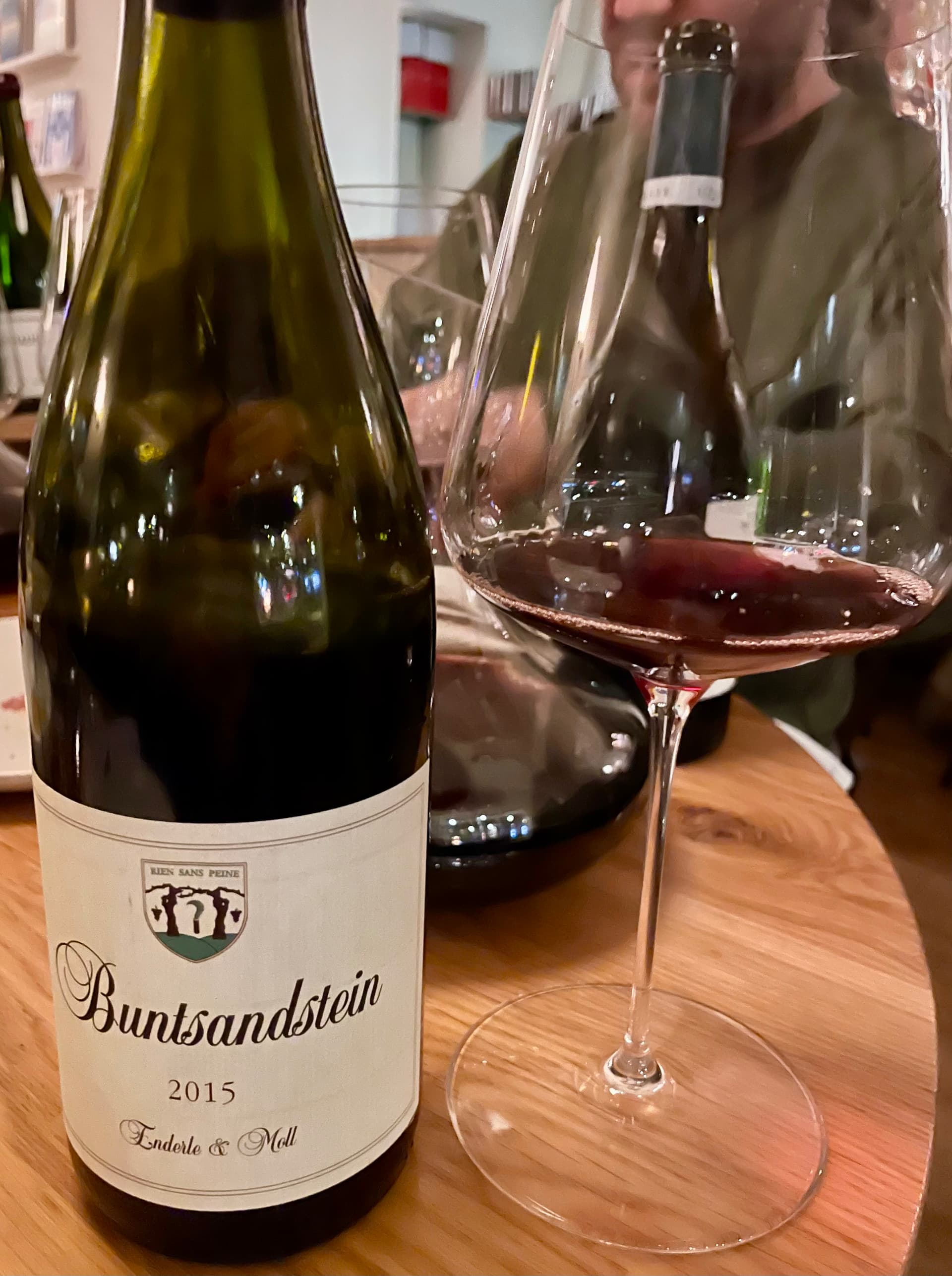 2015 WEINGUT ENDERLE & MOLL BUNTSANDSTEIN BADEN PINOT NOIR- decanted at the table; this comes from a really good vintage and a highly regarded producer and the Buntsandstein, or colored sandstone, is sourced from prime parcels of vines around 60 years old; the color was a youthful red purple and the nose and taste profile included smoke and mineral laced savory red fruit with burnt red cherry, red and black currant most prominent; it was full bodied and sported a long, welcomed finish.