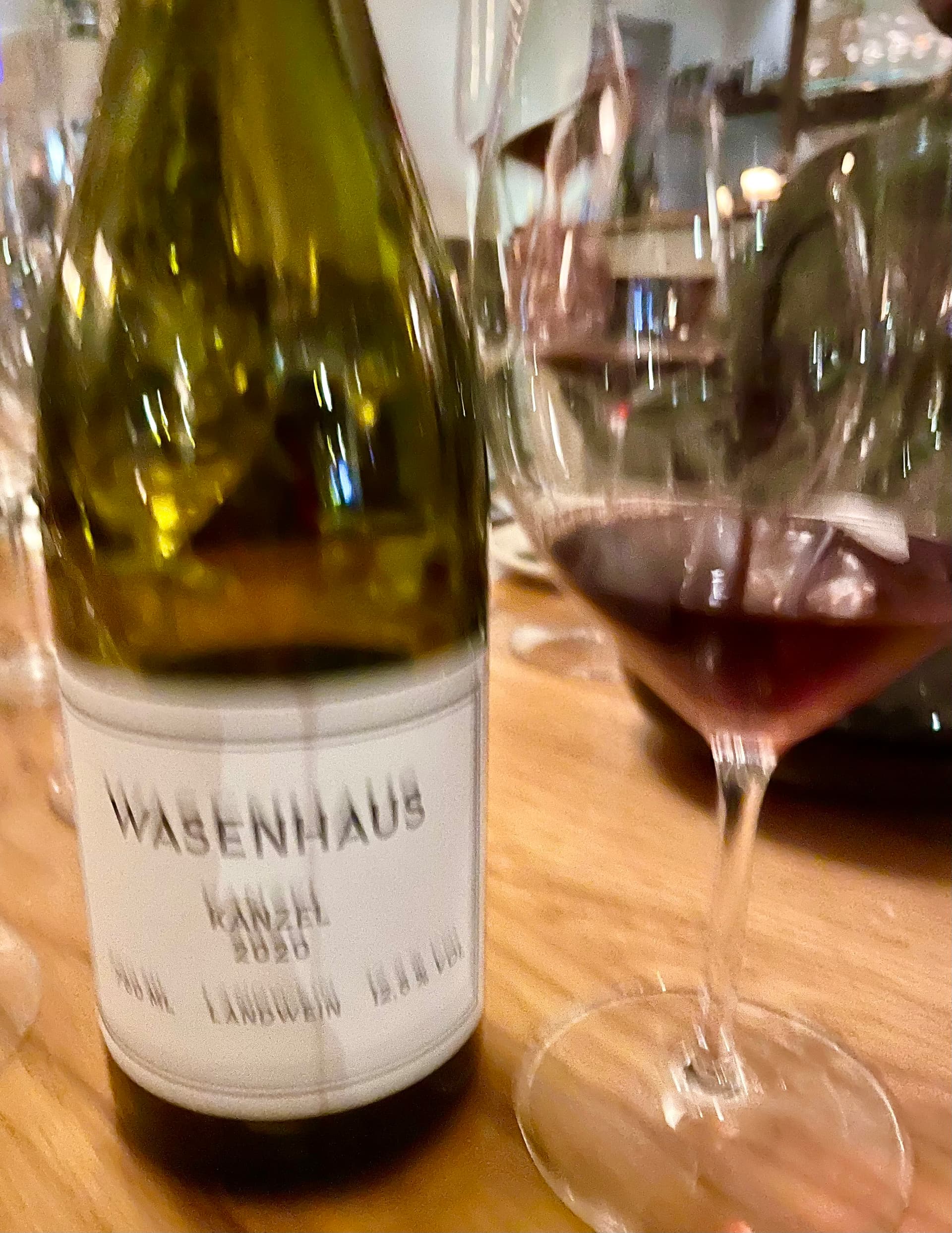 2020 WEINGUT WASENHAUS KANZEL BADEN PINOT NOIR- decanted at the table; the fruit for this wine was sourced from a vineyard that sits above Mohlin and is a blend of old-vine German clones and French plantings; some carbonic maceration occurs initially while about half of the whole clusters are maintained for fermentation; the color was a youthful red raspberry and the nose provided spicy red cherry aromas which continued on to be joined on the taste profile with smoke accented wild red berries, burnt cherry and black raspberry; it had a nice mouthfeel and fruity finish.