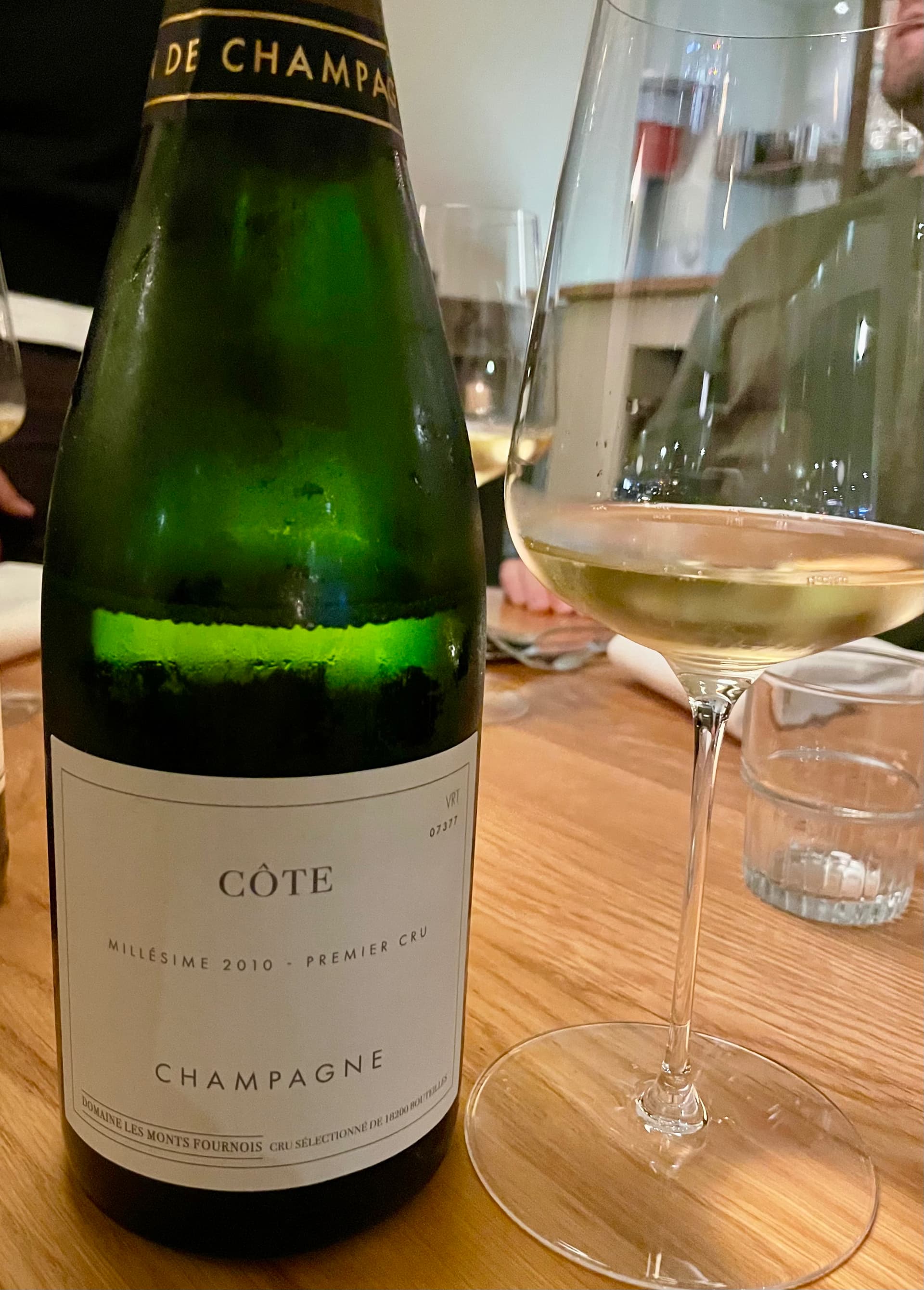2010 DOMAINE LES MONTE FOURNOIS COTE VERTUS EXTRA BRUT 1er Cru- bottled June 23, 2021, disgorged in October 2023 and dosed at 3.4 gpl; this 100% Chardonnay had a straw yellow color and initially offered aromas that suggested power and complexity which was confirmed once tasted; it evolved and expanded over the evening starting out more with citrus notes and moving on with mineral and chalky yellow apple, tangerine, apricot and bruised fruit which is probably due to its extended time on the lees stated to be about 10 years; it was super creamy and had some body adding weight to the mouthfeel; it most definitely served to prepare our palates for all to follow.