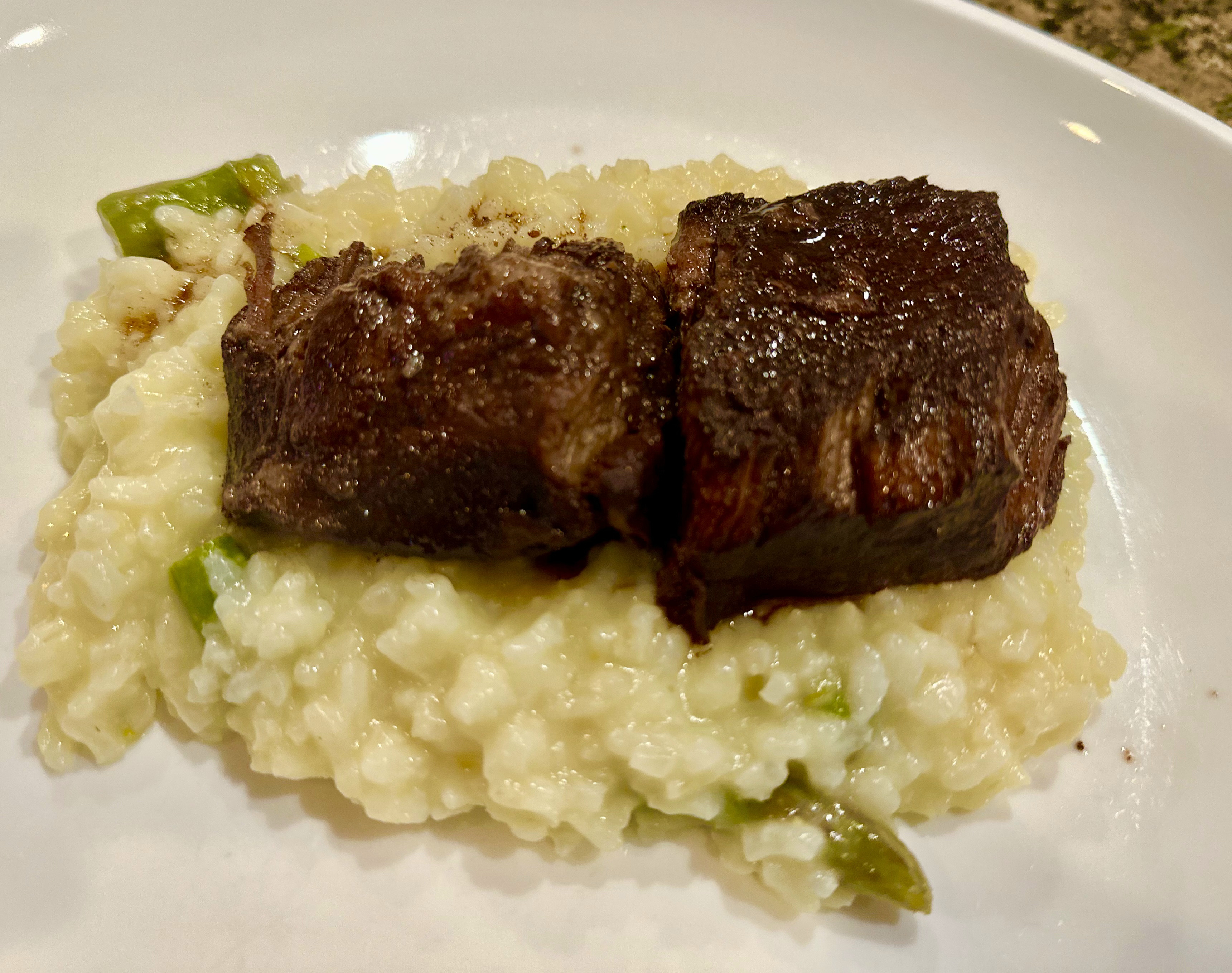 I cut the Flannery Zabuton into slices for the braise, and had two pieces of Morgan Ranch in the braise alongside it, using this recipe as my basis, my tried-and-true red wine braised short ribs. I used a basic Cotes du Rhone, one that is basically undrinkable though not flawed, as my wine for the braise. Each taster was served a piece of each short rib on a bed of asparagus risotto.