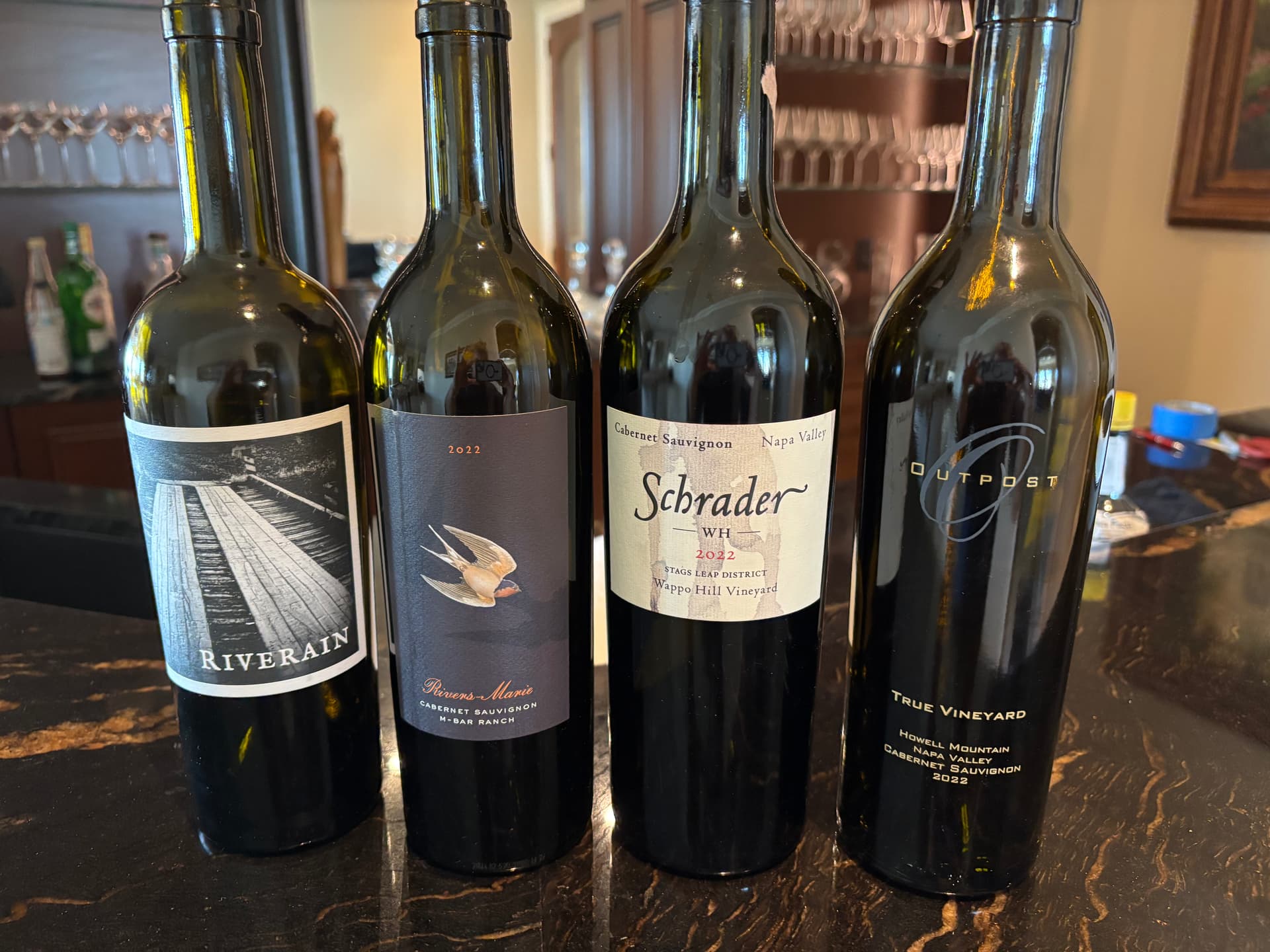 What was left of the bottles I retested completely blind the following night. (black glasses and a lazy-susan.) Honestly, the wines had changed a bit but still there were more similarities than differences - I really struggled to pick out the wines - the first night I got 2 out of 4 correctly identifying the Schrader and the Riverain. On the lazy Susan, I went round and round and I think I picked the Schrader out correctly maybe twice out of the four times. Between palate fatigue and just being stupidâŚ