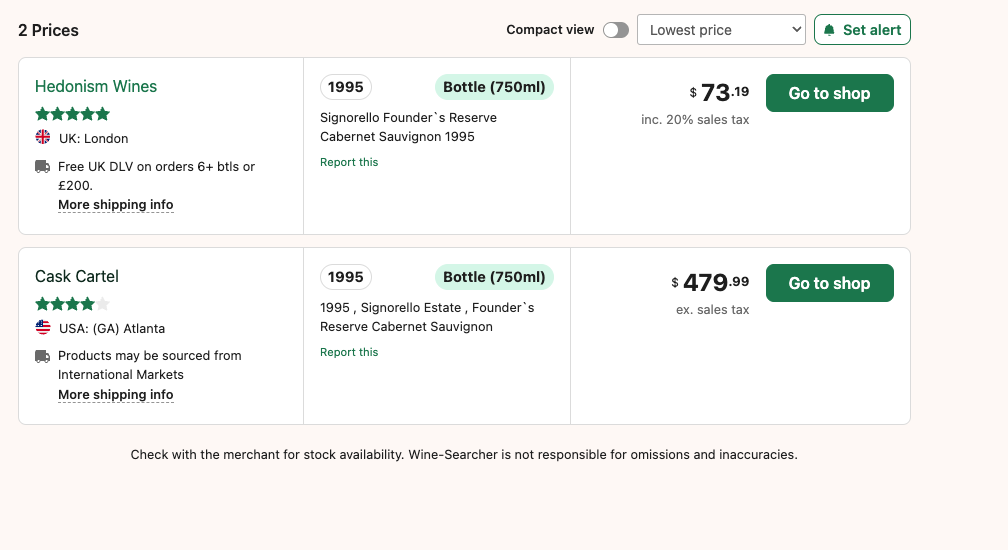 If I were cask and cartel (the Cartel name should alert you) I would have more than one alias for the same wine. The first is the stupid F you price, then a second a cheaper one that looks good by comparison.
