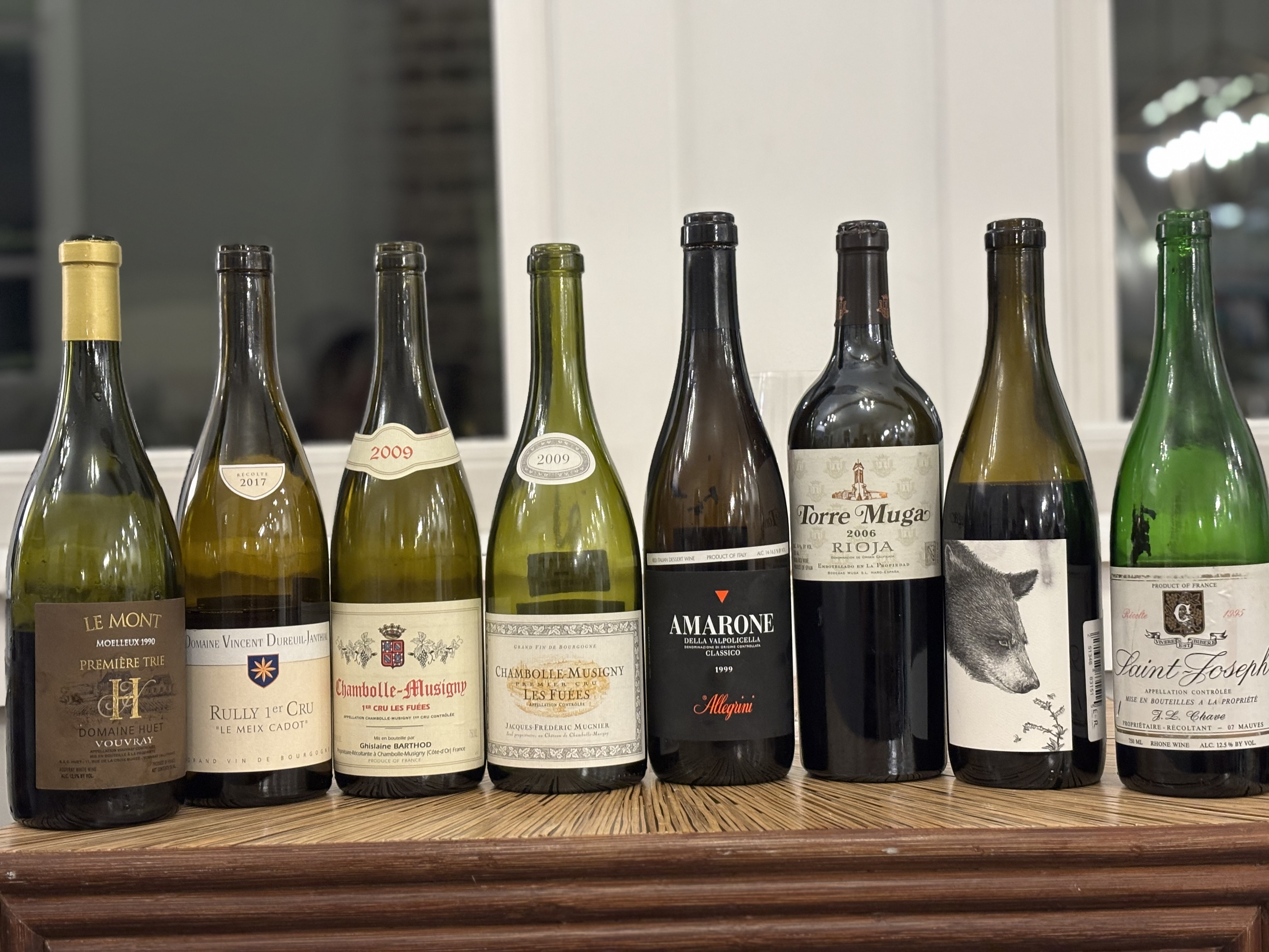 Wine 2: people called this pretty but muted, although after a couple hours this opened up into a beautiful wine with a bit more structure than the Mugnier, but with a bit less lift. Ripe strawberry fruits, with a bit less tension, but stately elegance on the finish. This gained a lot in power and elegance over time, and by the end of the night, to me at least, surpassed the Mugnier. Lots of guesses, including a lot of Jadot, but people ultimately were not that surprised by:
