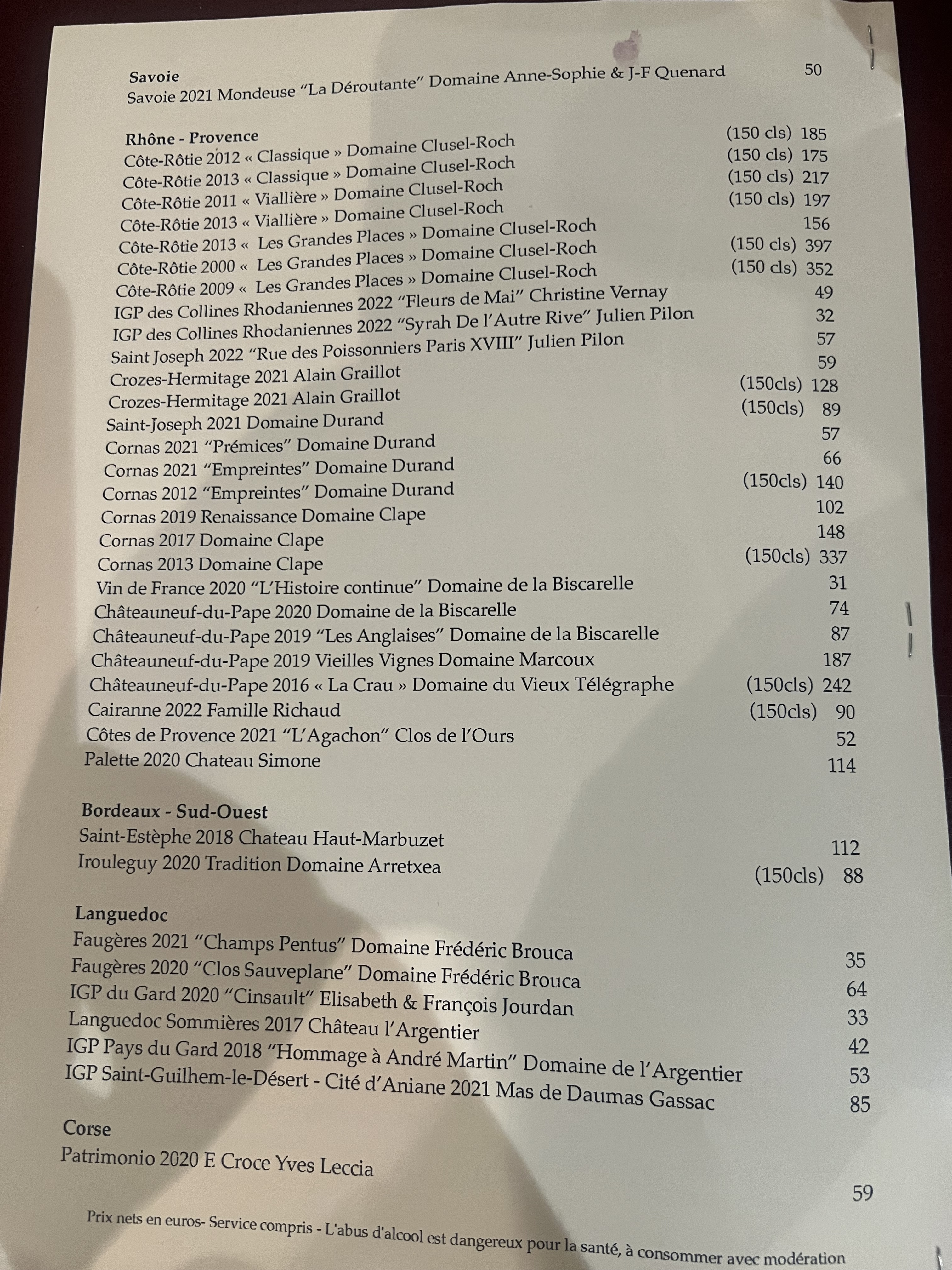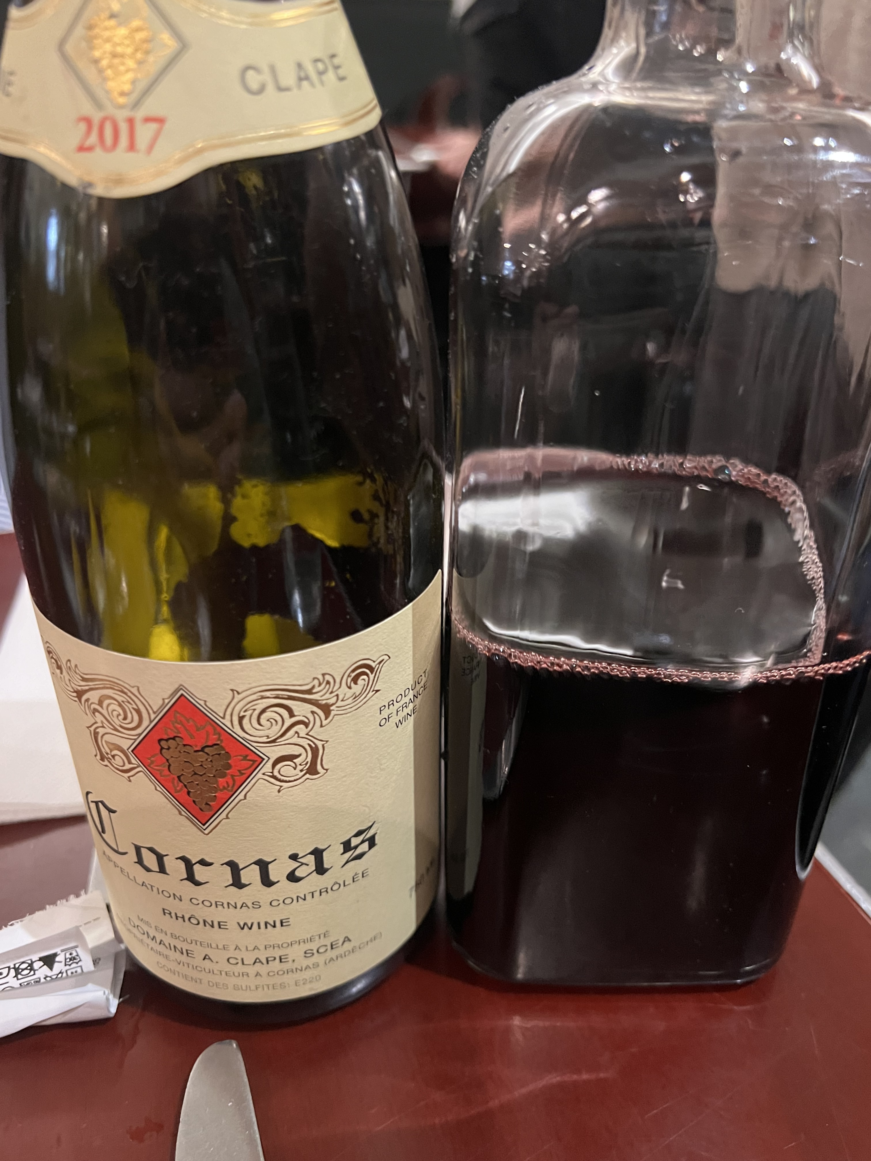 We happened to drink the '17 Clape when we were there a few weeks ago as well (also drank a PYCM St. Aubin Hommage à Marguerite) and ended up sitting alongside Tim Johnston, who is the original owner. He was fun to talk to and he generously shared a couple glasses of the '13 Clape with us, which I think is ultimately the better wine, but was not as forthcoming as the '17 (the '13 was also from a magnum). Your assessment of the food is spot on. We though it was delicious.