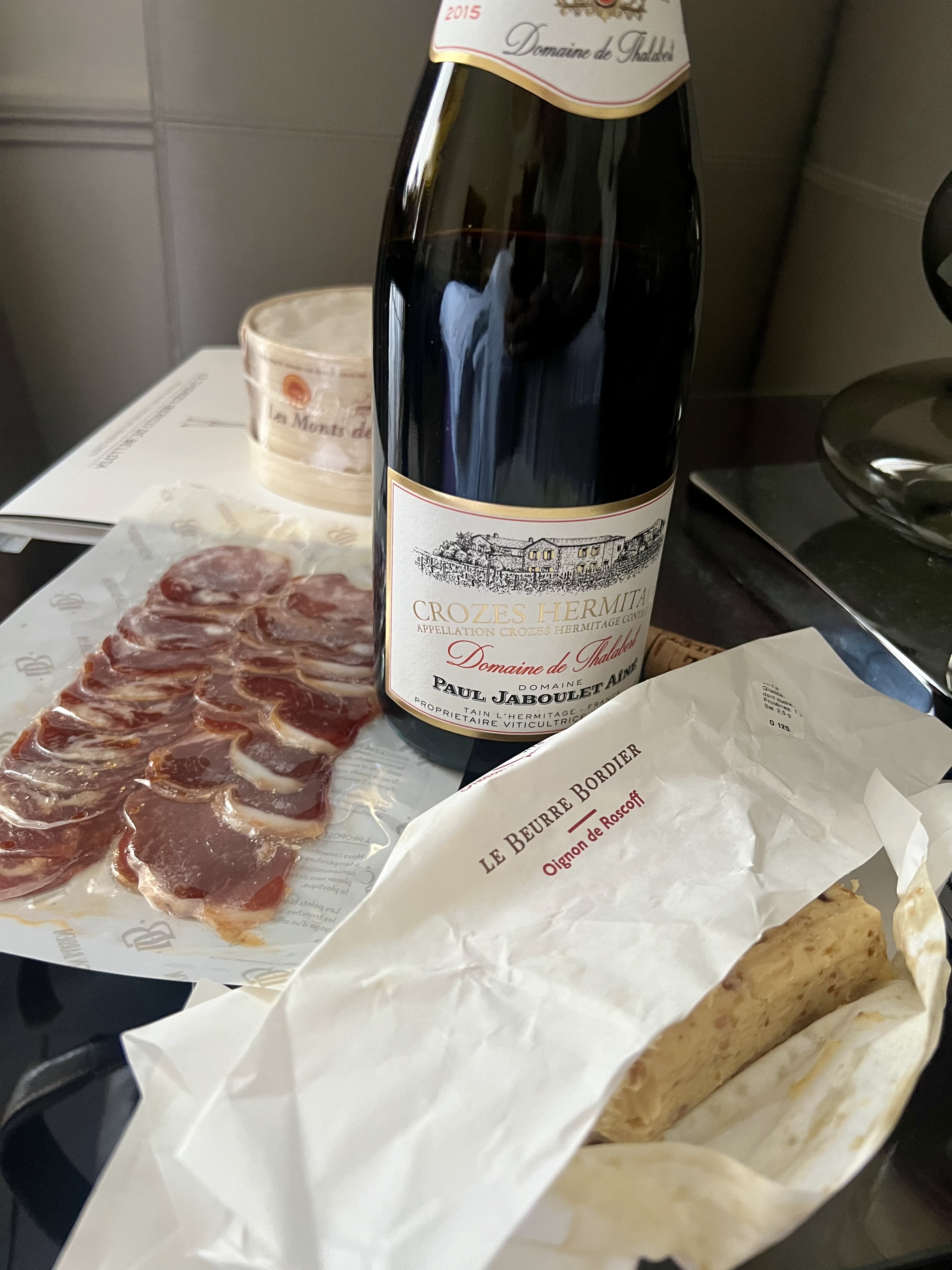 Our room wasn’t ready, which my wife took as a sign to go shopping. I picked up some iberico charcuterie, bread, Bordier (Roscoe onion, which is my favorite), mont d’or, and then crashed a Nicolas for a hotel drinker. If you’re new to the Paris game… there’s a Nicolas wine store every three to four blocks and they tend to have entirely uninspiring wine but can surprise you with random specials in a fridge unit. Galleries has everything under the sun (I considered picking up an older Rougeard), but is usually over priced. Pre-party pic below.