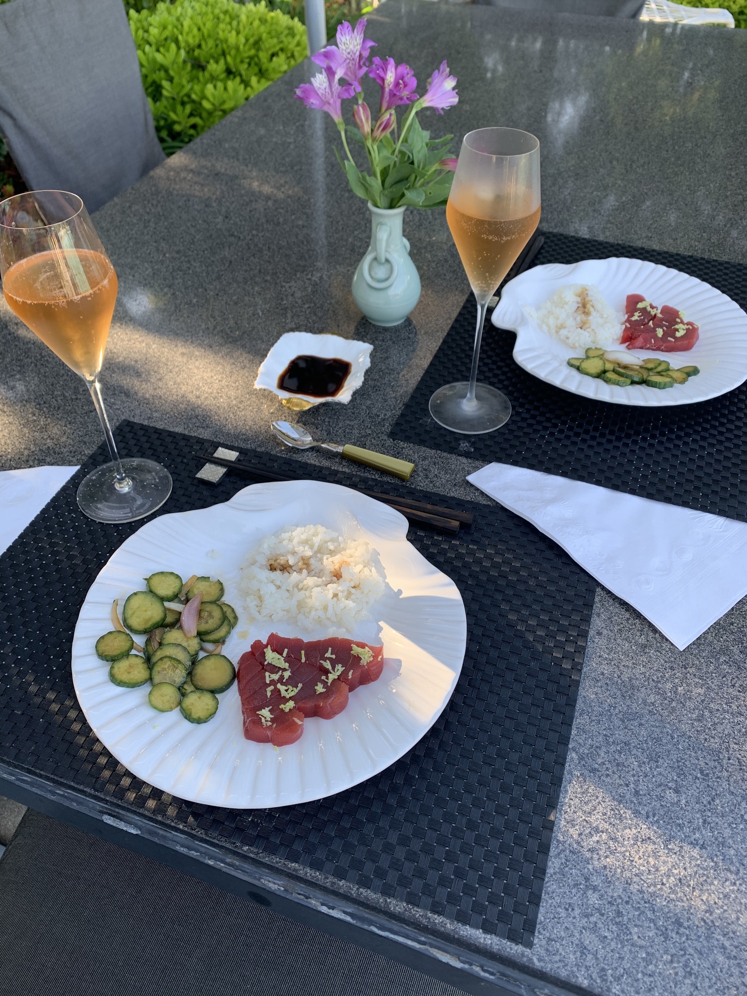 Went to Mitsuwa in West LA and picked up some nice stuff. The Egly Rose we drank is beautiful. Five years on the lees, presumably a 2013 base, this is a very special rose. Just everything in balance with great fruit and a perfect finish. With some blue fin sashimi as a starter and black cod bok choy and oyster mushrooms in a dashi broth, what could be better. Perfect for a nice evening in the yard!!