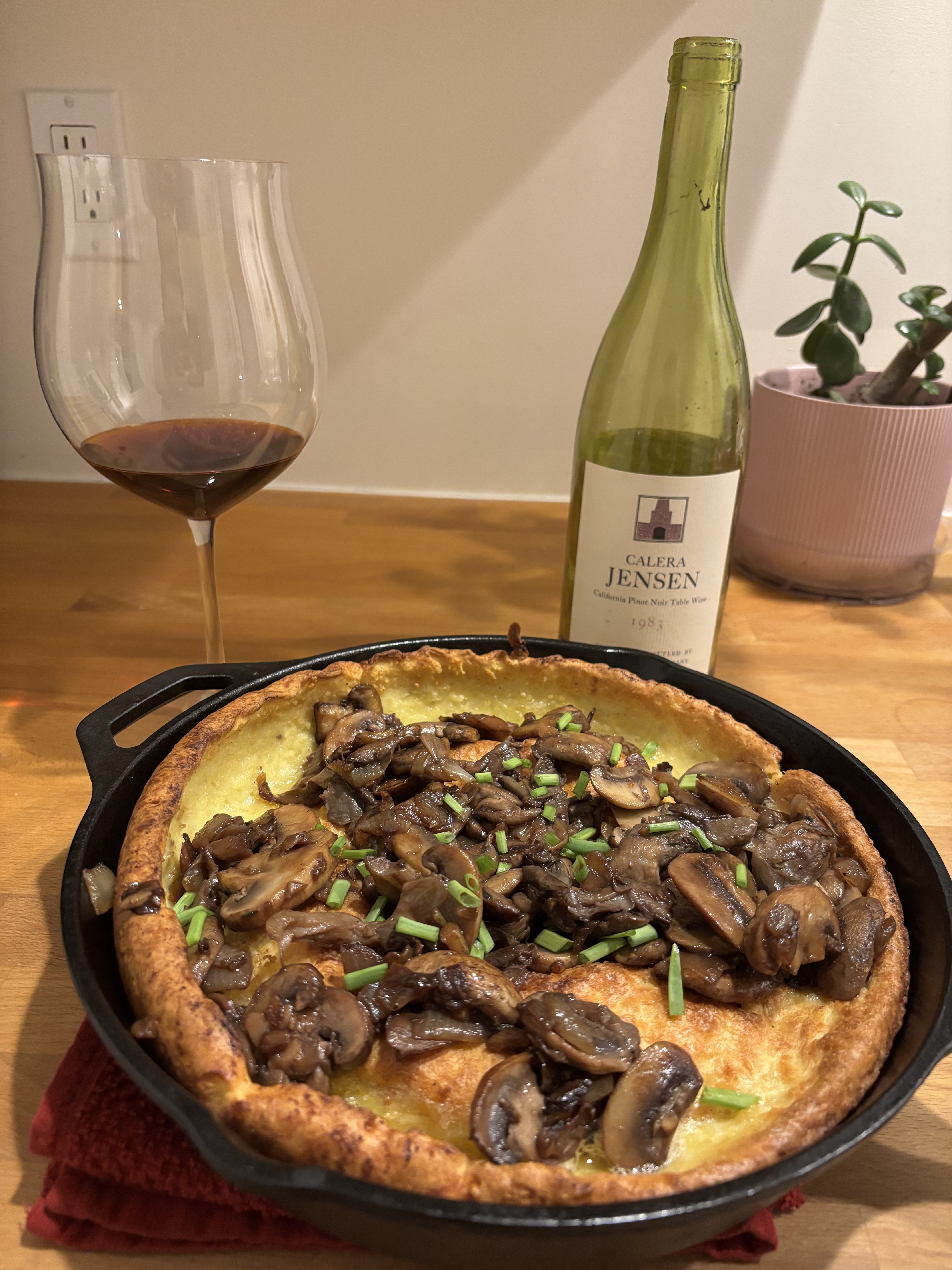 I was inspired by @Jim_Cowan ‘s mention of soufflé- it sounded fantastic. I was looking up recipes but realized I don’t have a soufflé dish. So, I adapted and made a soufflé-ish Dutch baby- with mushrooms of course given all the mushroom suggestions. And, inspired by a mention of sweet potato from @Dave_H, I roasted up some delicata squash for the side, which has a similar starchy subtle sweetness. The food and wine went together magnificently.