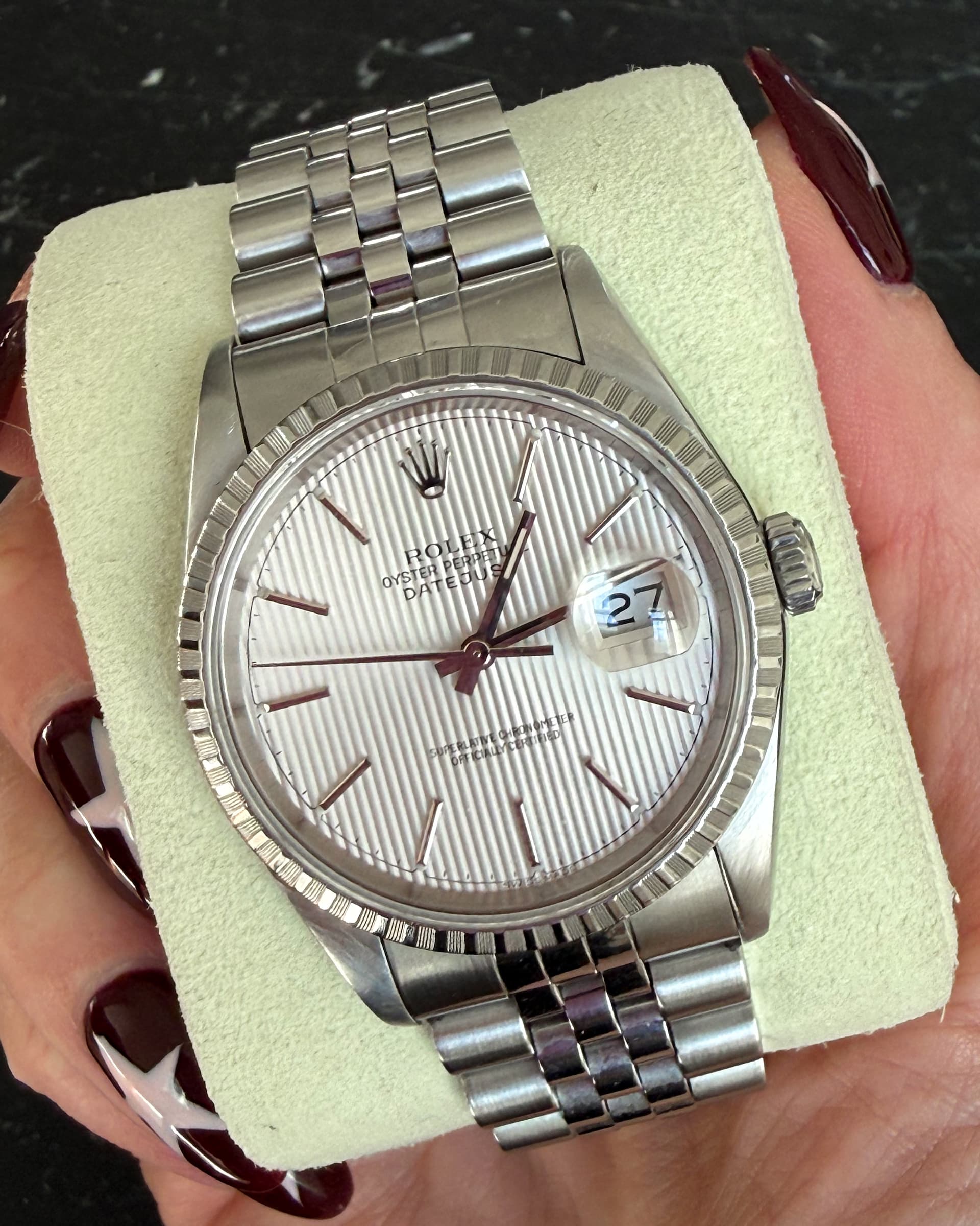 This is an excellent vintage Rolex with the very desirable, discontinued Tapestry dial (this is what drew me to the watch initially). DM with questions or for more pics