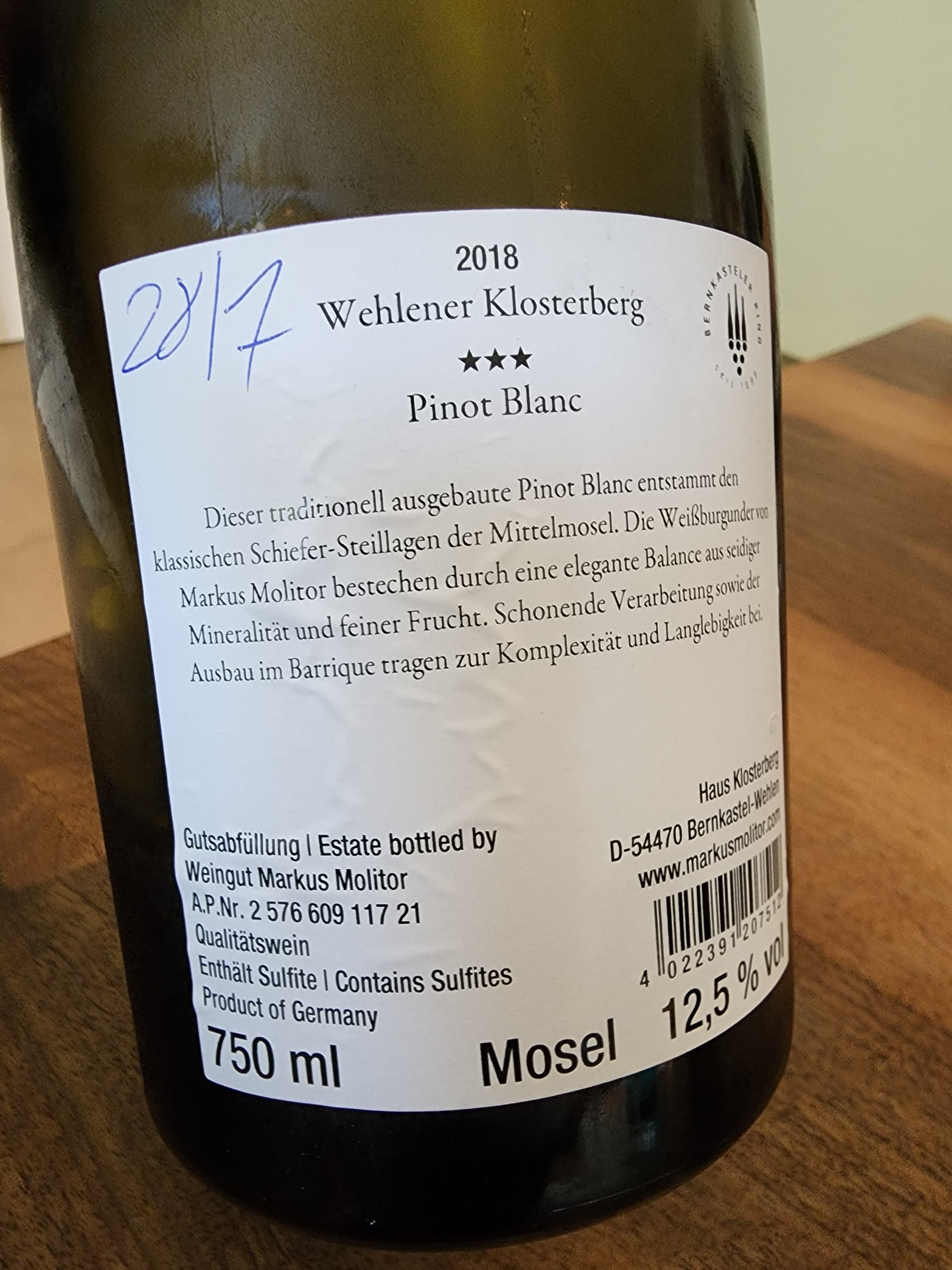 Their dry quality wines (with no Prädikat) are given a rating of one to four stars. “The history is a little complicated,” Piet says. The brothers were frustrated at the inflated Prädikatsweine, such as cheap Spätlese or Auslese sold at discounters, so they decided to bottle their wines without Prädikats, but some of their clients objected. As a compromise, they started labeling all their dry Qualitätsweine, those mostly under the Haus Waldfrieden logo (Alfer Hölle, Neefer Frauenberg), without Prädikats and with stars instead.