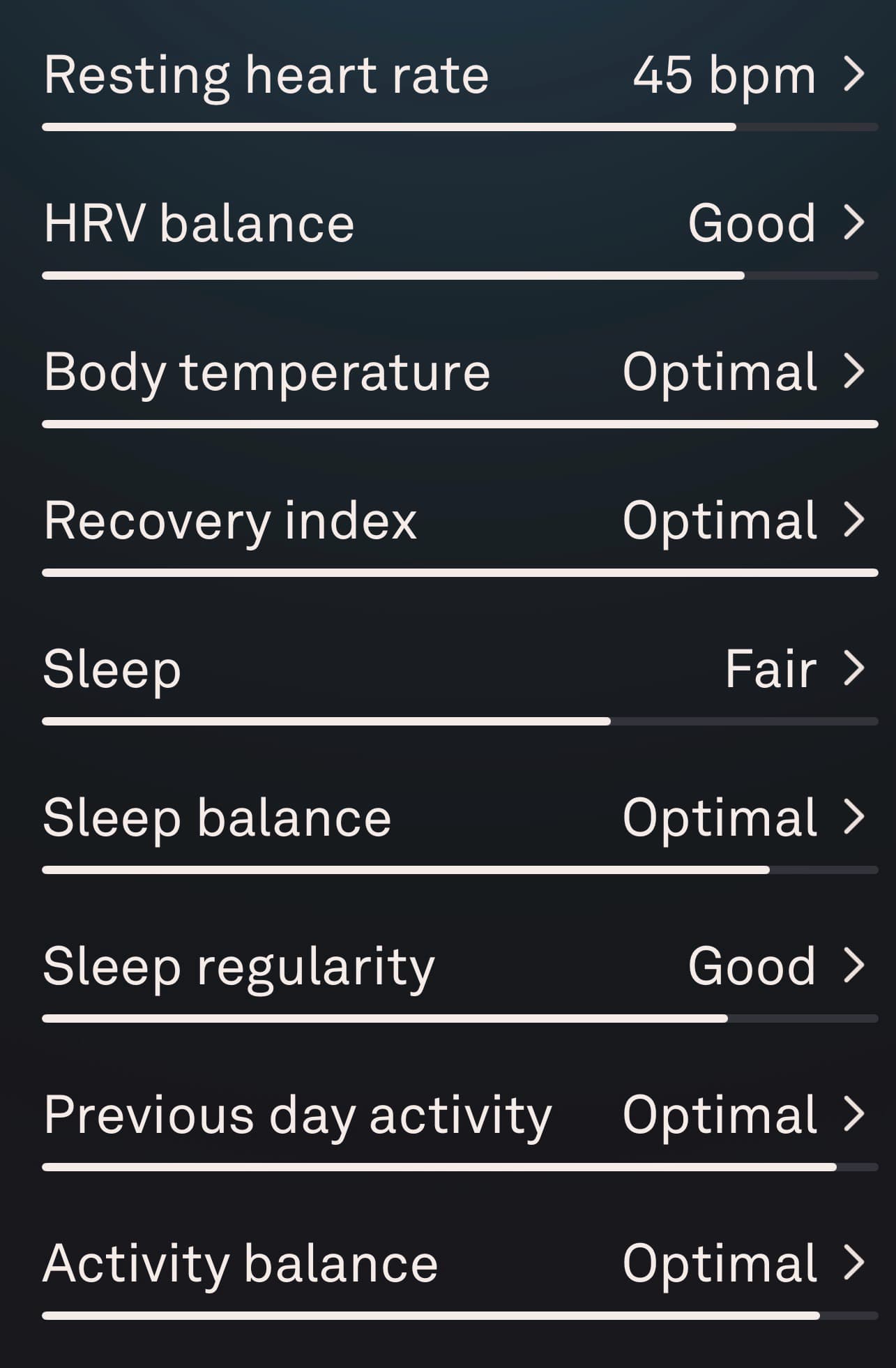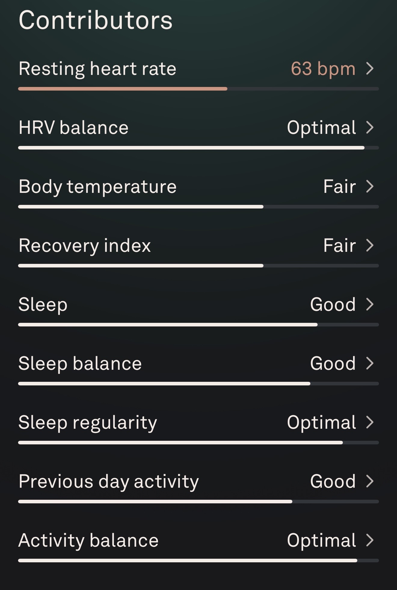 Resting heart rate is usually 48-50 and went to 63, and HRV usually 50-60 but went to 35.