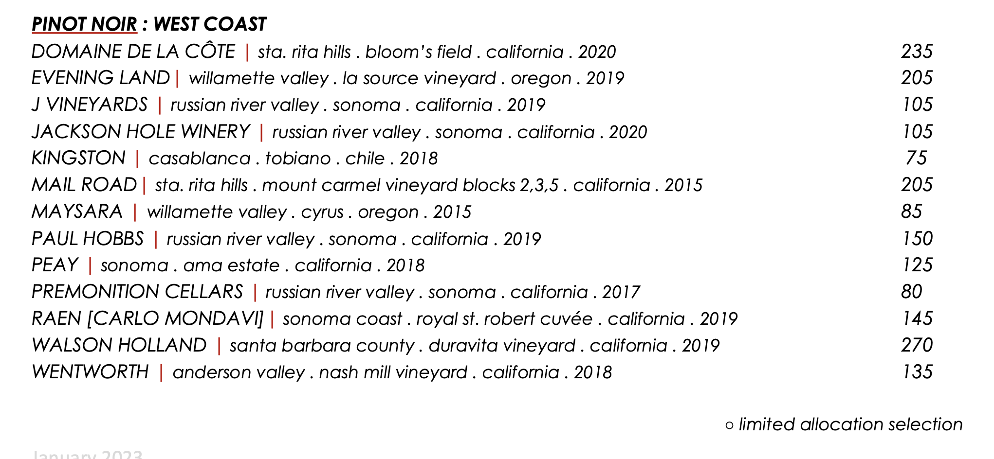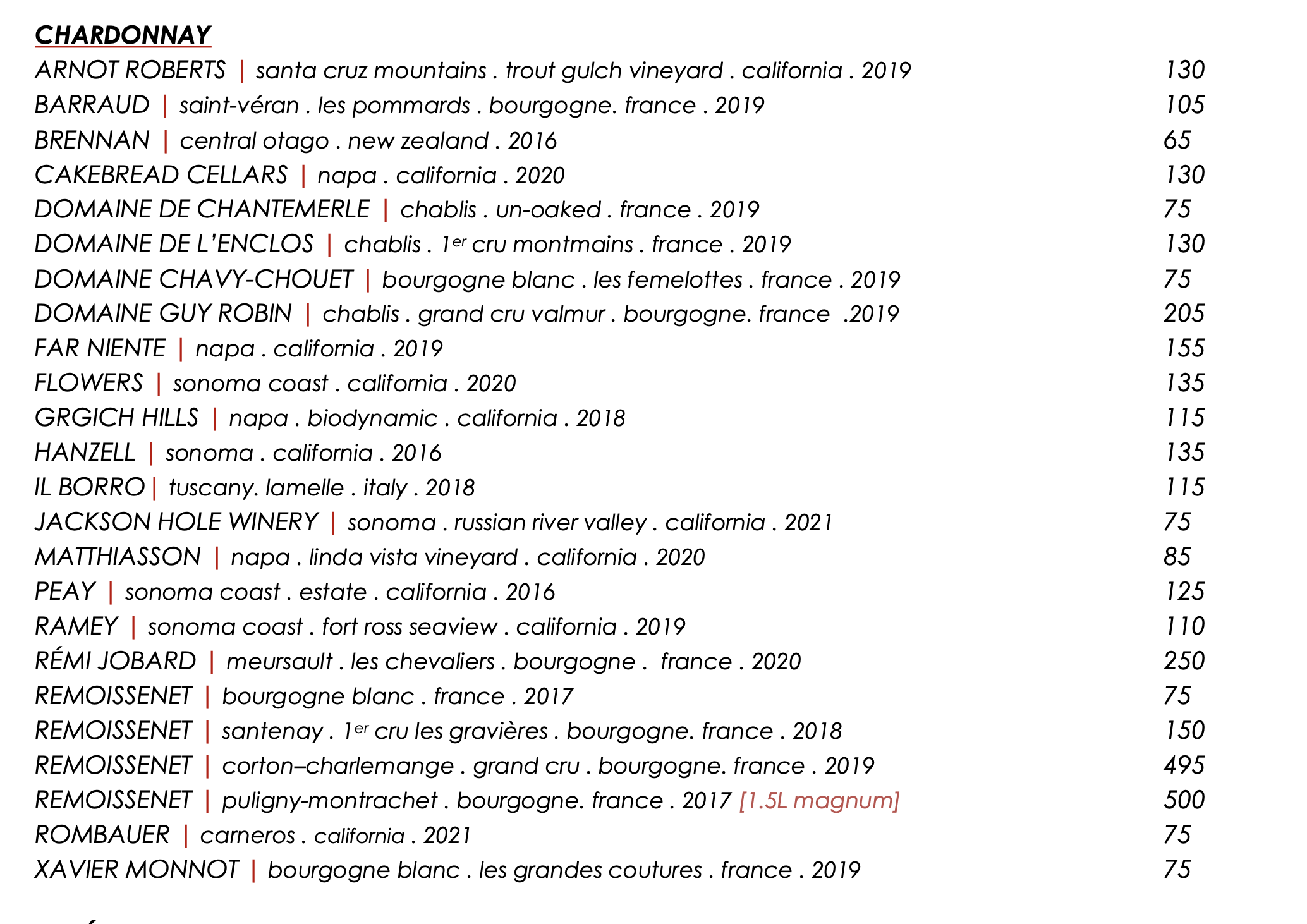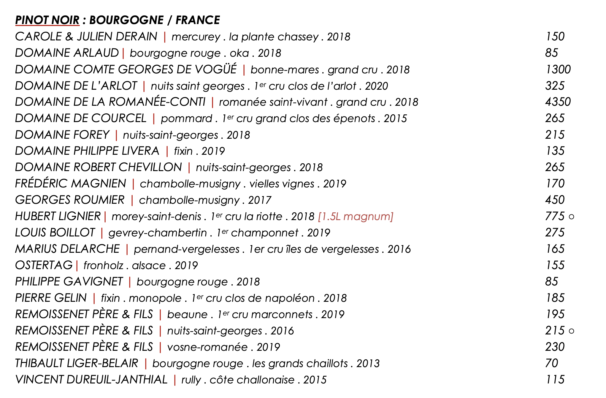 2017 Roumier Chambolle-Musigny $450 – banger of a vintage and great wine drinking well now