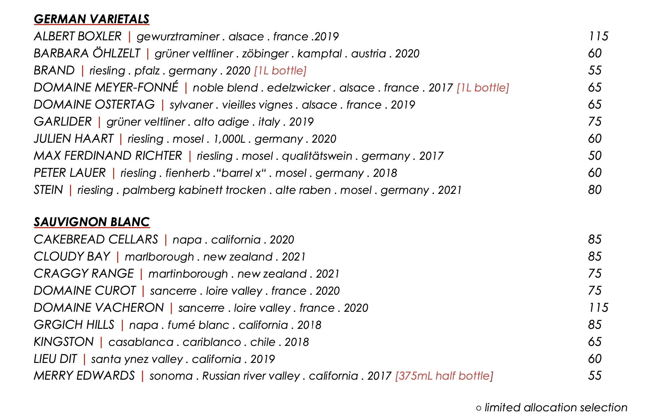 Mathiasson Chard $85 – crowd pleaser and tasty. Underrated