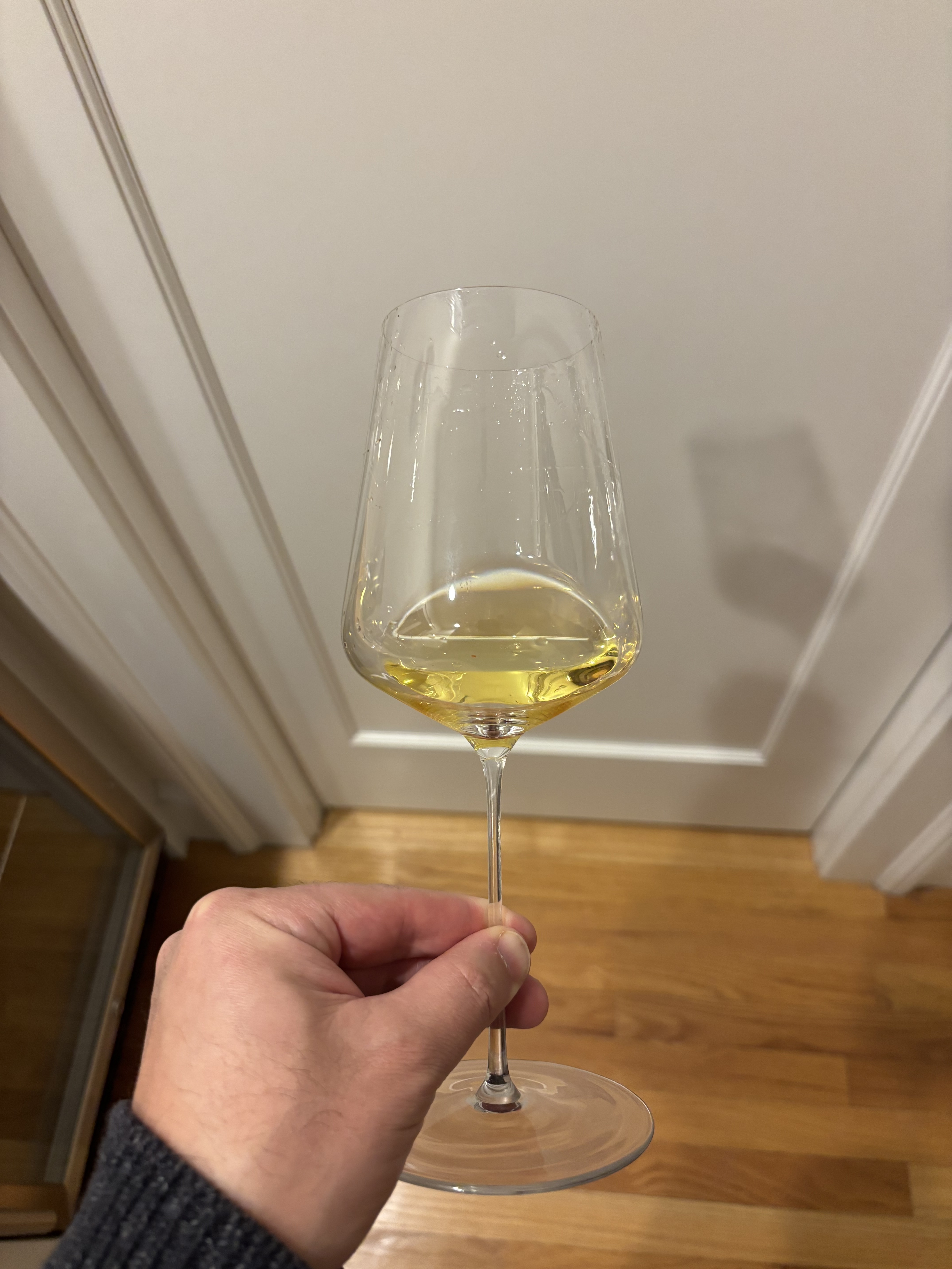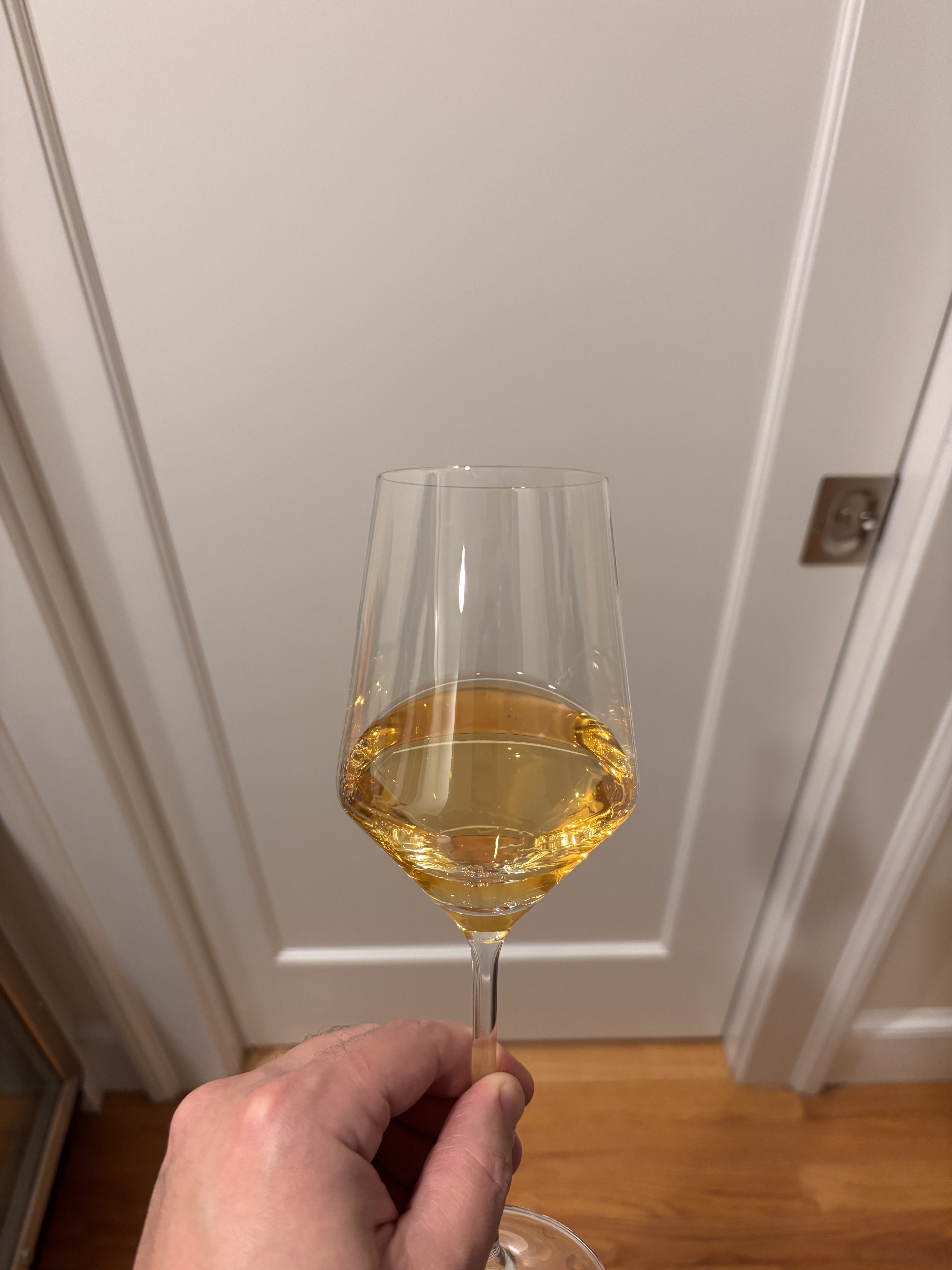 Cork covered with dark mold and sunk a good 1/8" below the rim of the bottle. Nonetheless, the wine inside was perfect. Incredibly youthful appearing- luminous pale yellow, super clear.