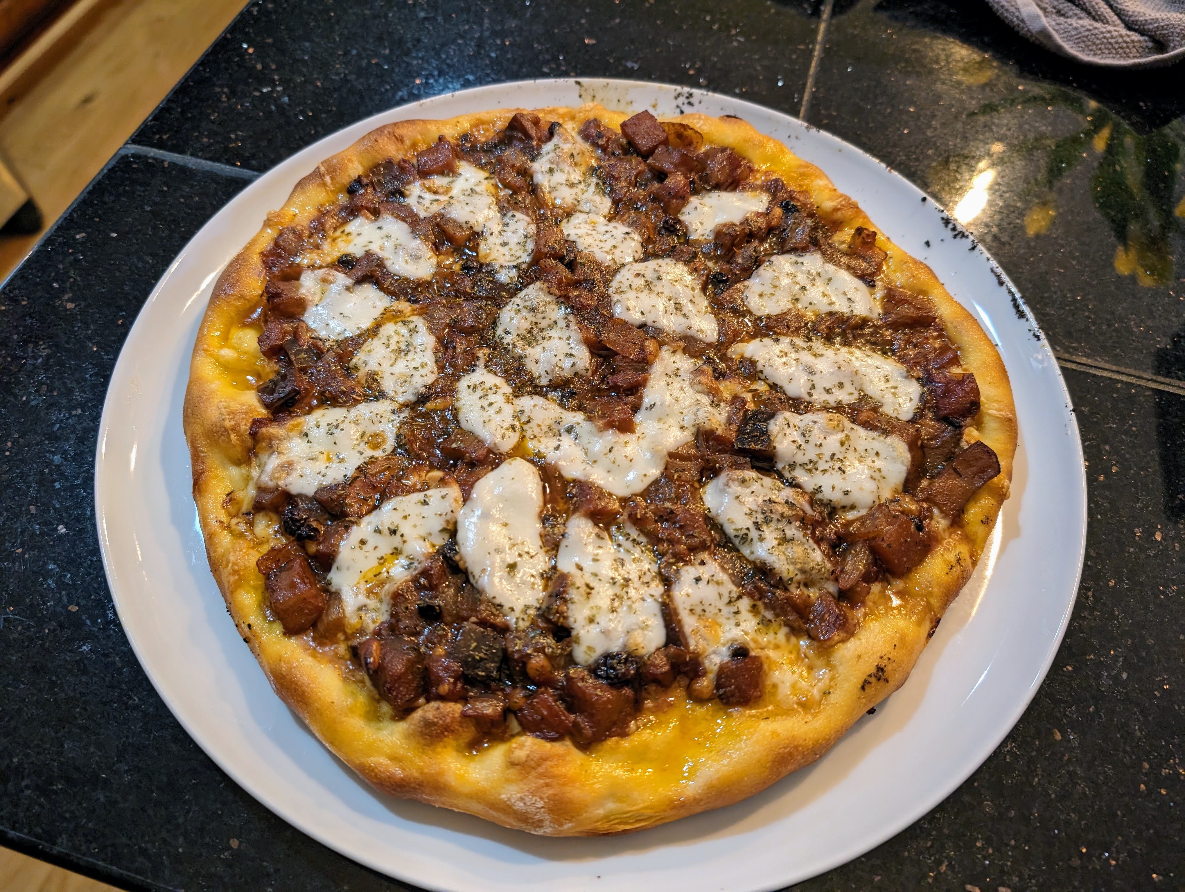 Made half dozen pies last weekend this was our favorite (homemade meatballs, basil, mixed cheese blend).