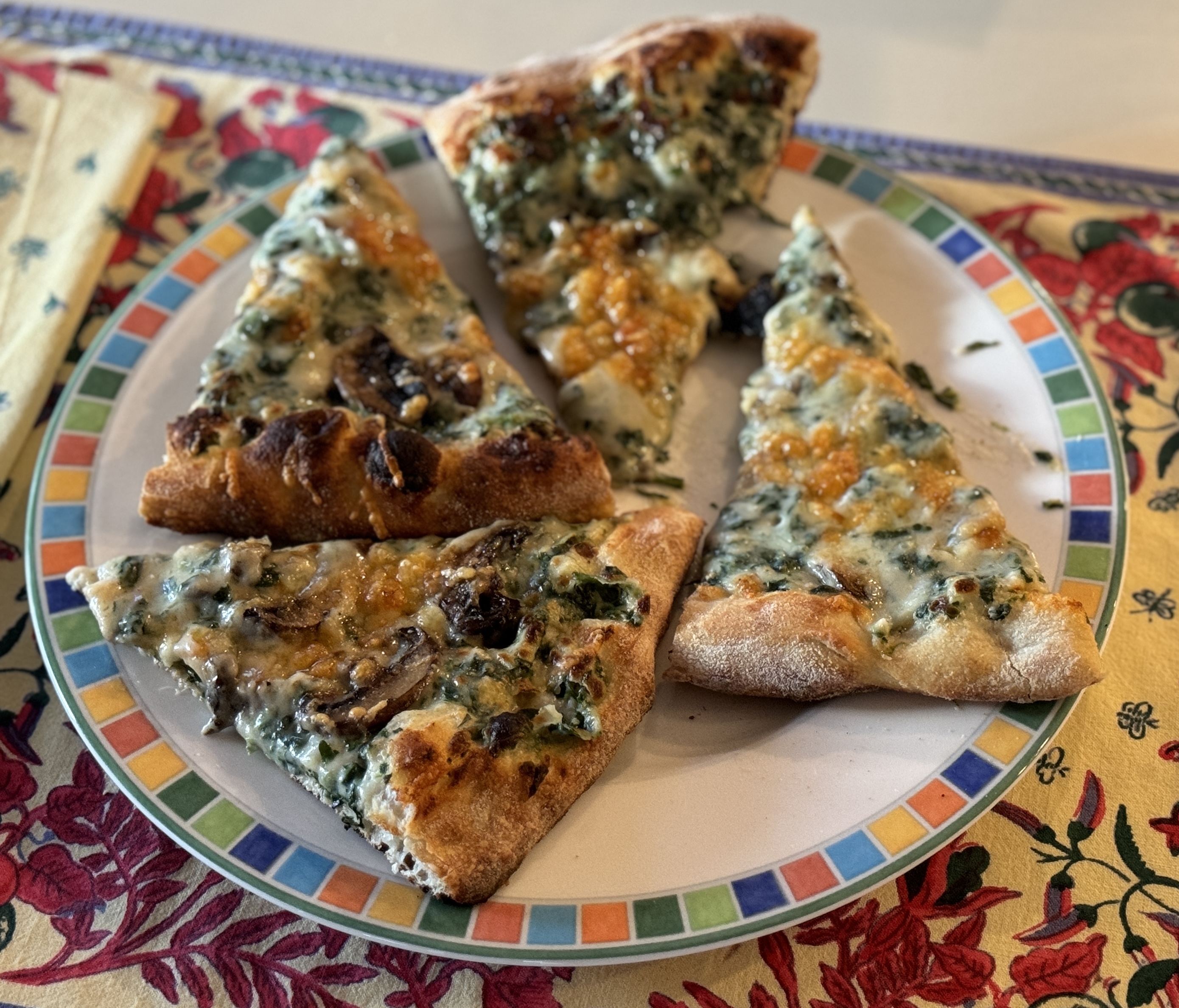 made this on dough on Sunday and cooked one pizza (spinach and mushroom) on Tuesday and a simple cheese pizza tonight.