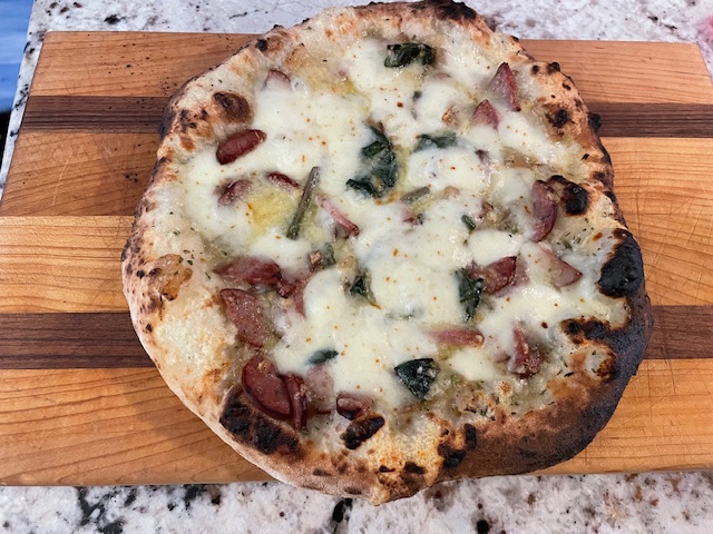 Caramelized Vidalia Onions, smoked sausage, Swiss, fresh Moz, ramps