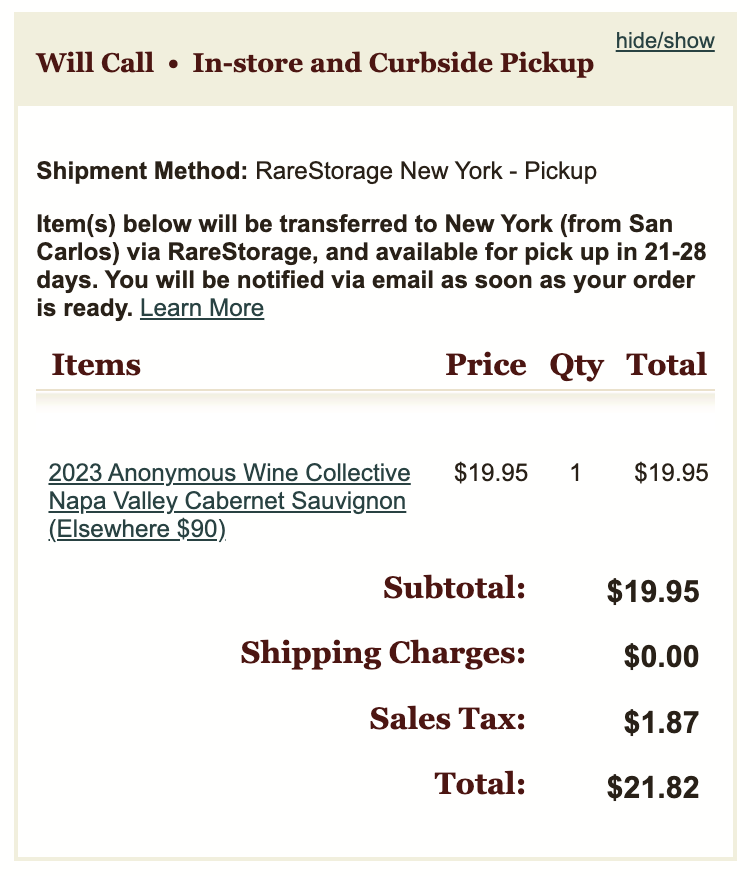 (I would think pickup at the NYC retail store would be dicey. K&L CA hands off to RareStorage and washes hands of the matter. RareStorage delivers to K&L NY basically putting it back in K&L’s hands.)