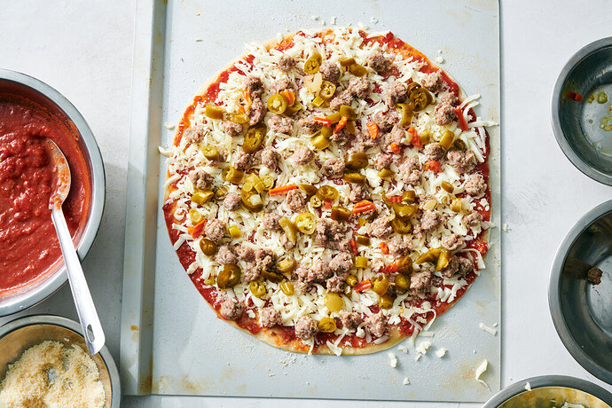 The links on this are a bit of a pain, as there is an article, a main recipe, a dough recipe, a sauce recipe, and a sausage recipe, all different links! Here they are (as “gift links” so should be visible to everyone):