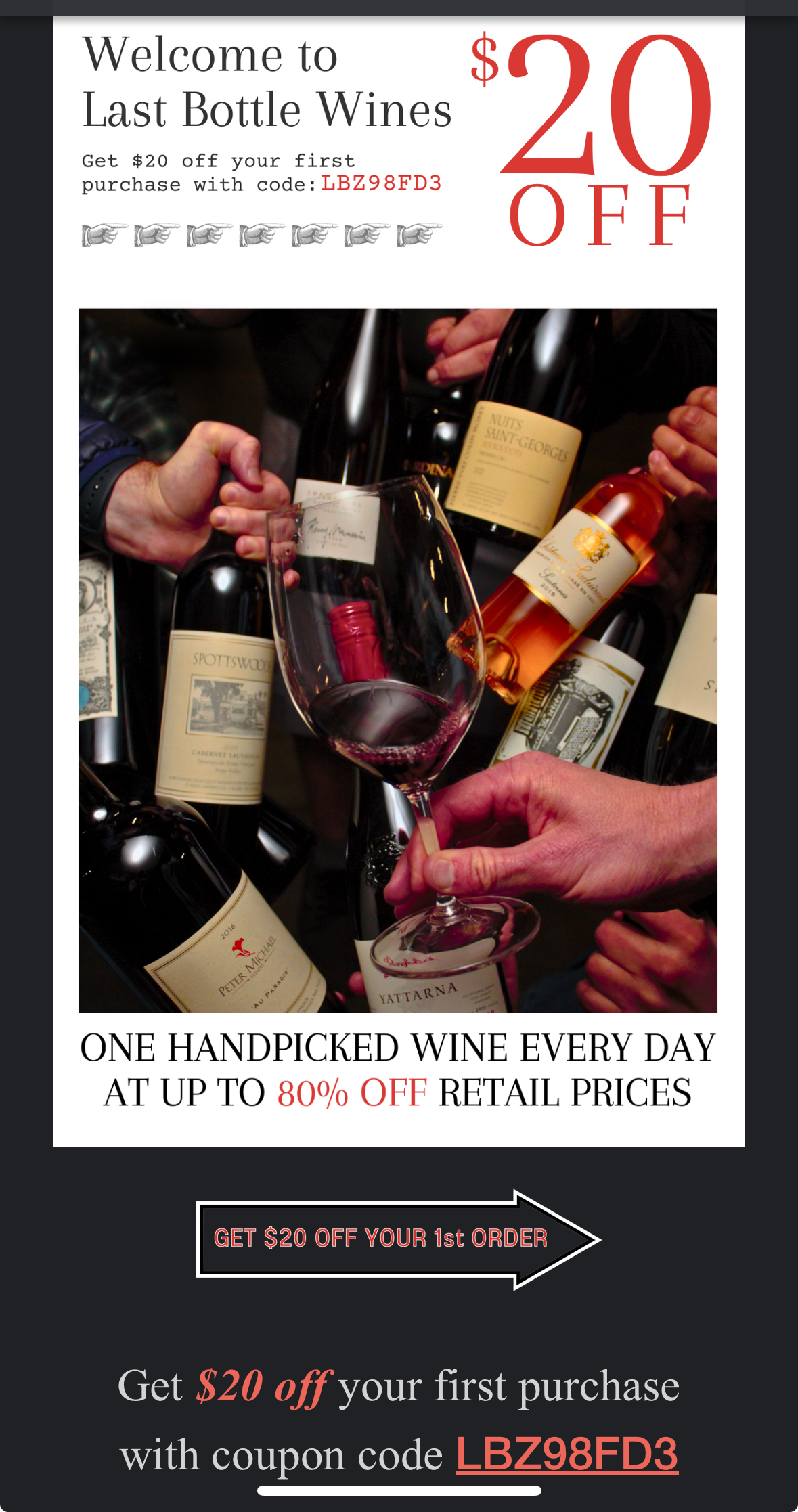 The discount code is sent to new subscribers. Unfortunately for me, I didnât see this thread or get the email with the discount code until after I placed my order for the wine.