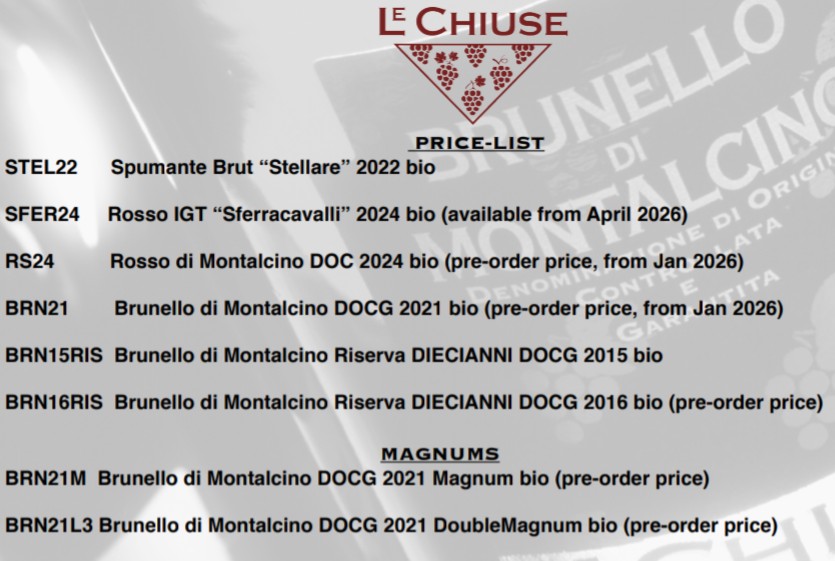 Not a typical CC offer. My yearly purchase is coming up and I have a few open slots in my case purchase direct from Le Chiuse in Montalcino. The wines are offered at cost and are for personal consumption only. Please DM for the price list if you’re interested.