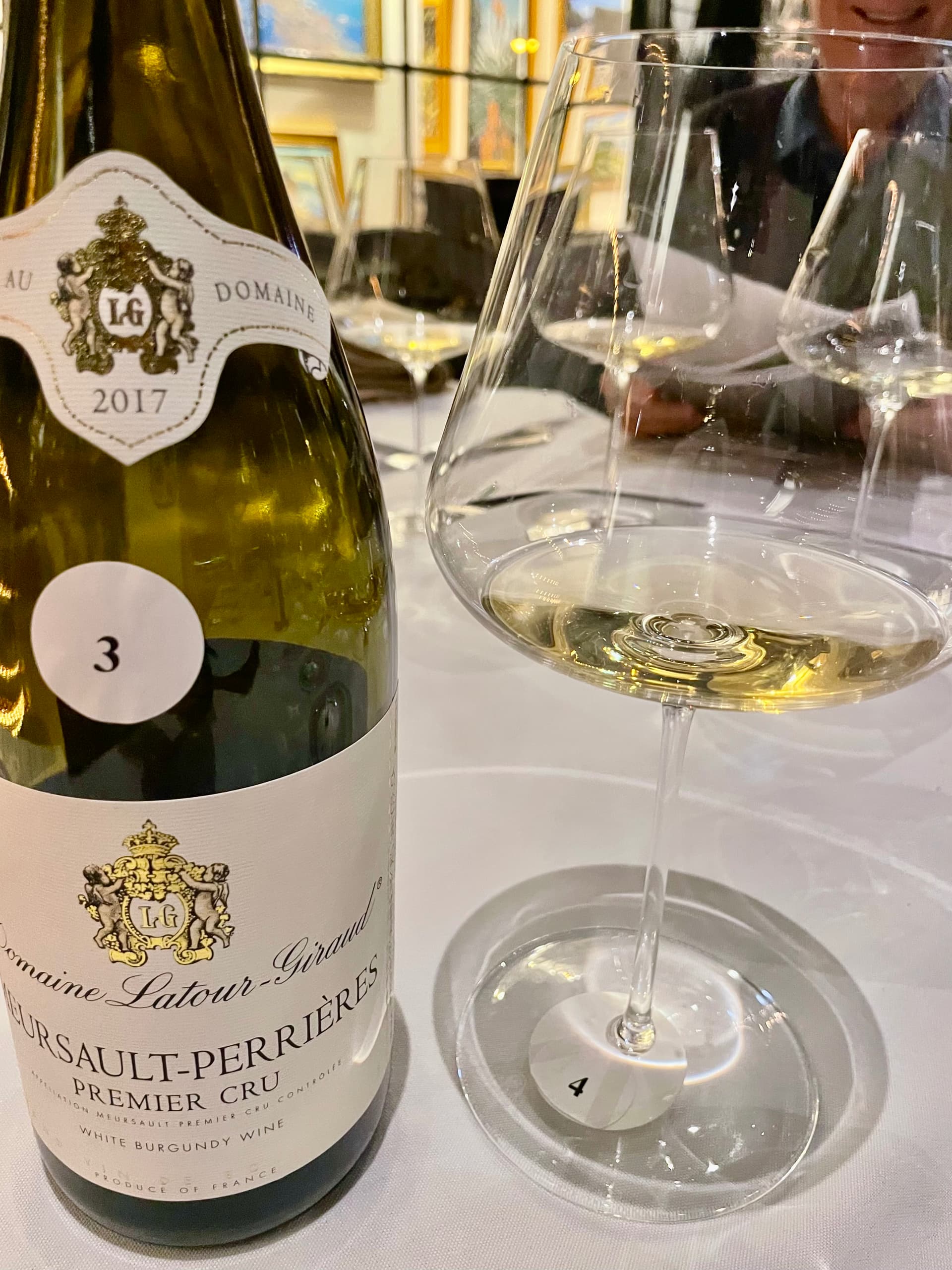 2017 DOMAINE LATOUR-GIRAUD MEURSAULT-PERRIERES 1er Cru- white Burgundy blind; it had a medium yellow color and inviting aromas of spicy, yellow apple that received a coat of honey on the palate; it was round, seamless, smooth and perfectly balanced with lots of finesse and charm; I had it as 4th in the flight as did the group.