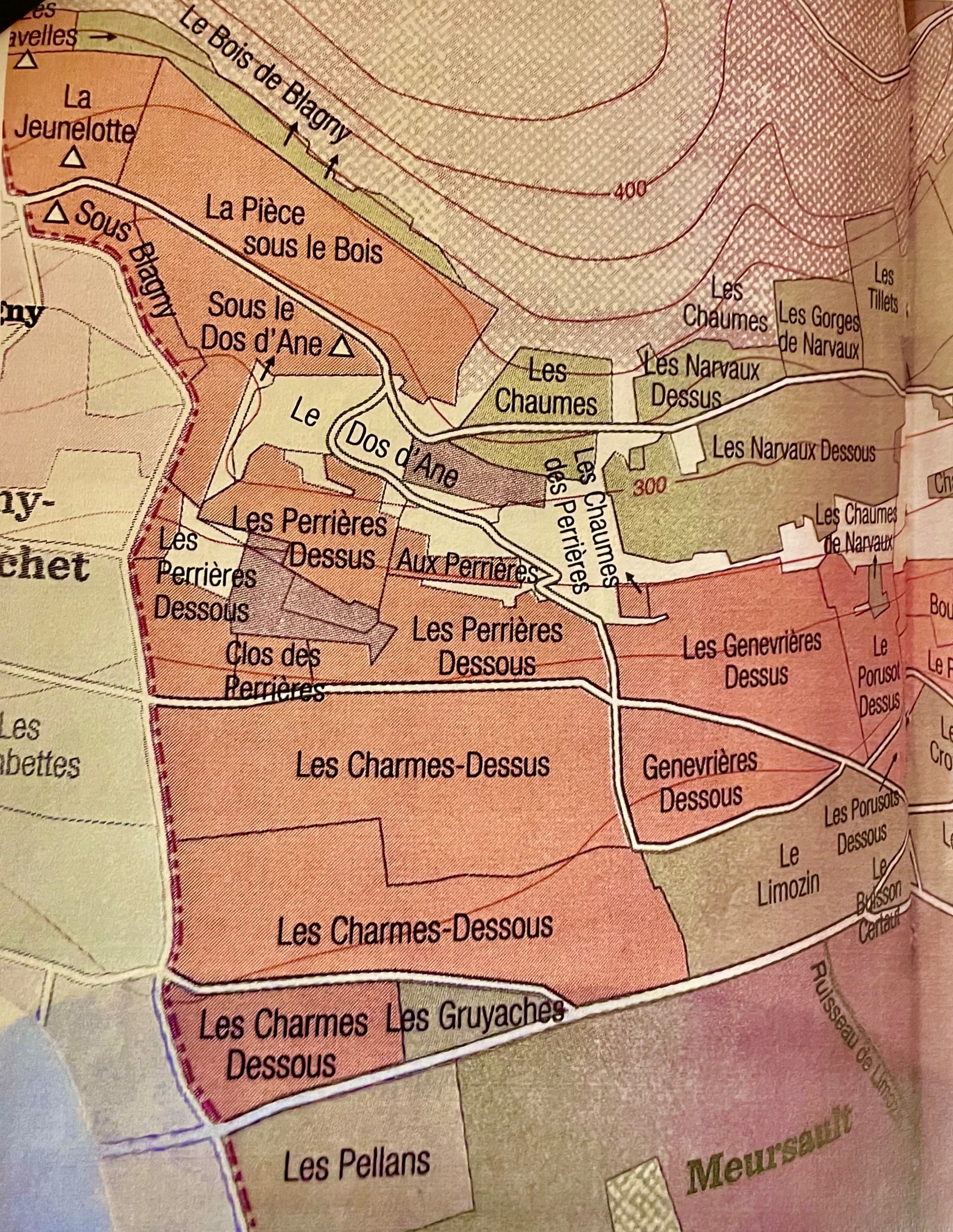 “Meursault has 17 premier crus, 29 if all subdivisions were counted separately, with 3 main board groups: the main band which begins with Perrieres, Charmes and Genevrieres and continues through Porusots, Boucheres and Gouts d’Or; a church around the hamlet of Blagny {La Jeunelotte, La Plece sous le Bois, Sous le Dos d’ans, Sous Blagny- all of which are usually sold as Meursault-Blagny} and the Santenots family on the Volnay border {Santenots du Milieu, Santenots Blancs, Santenots -Dessous, Les Plures, Les Cras, Les Caillererts}.” Perrieres, Charmes and Genevrieres are the stars with Perrieres normally quoted as there best.” He does not think these 3 will ever be promoted to Grand Cru status.