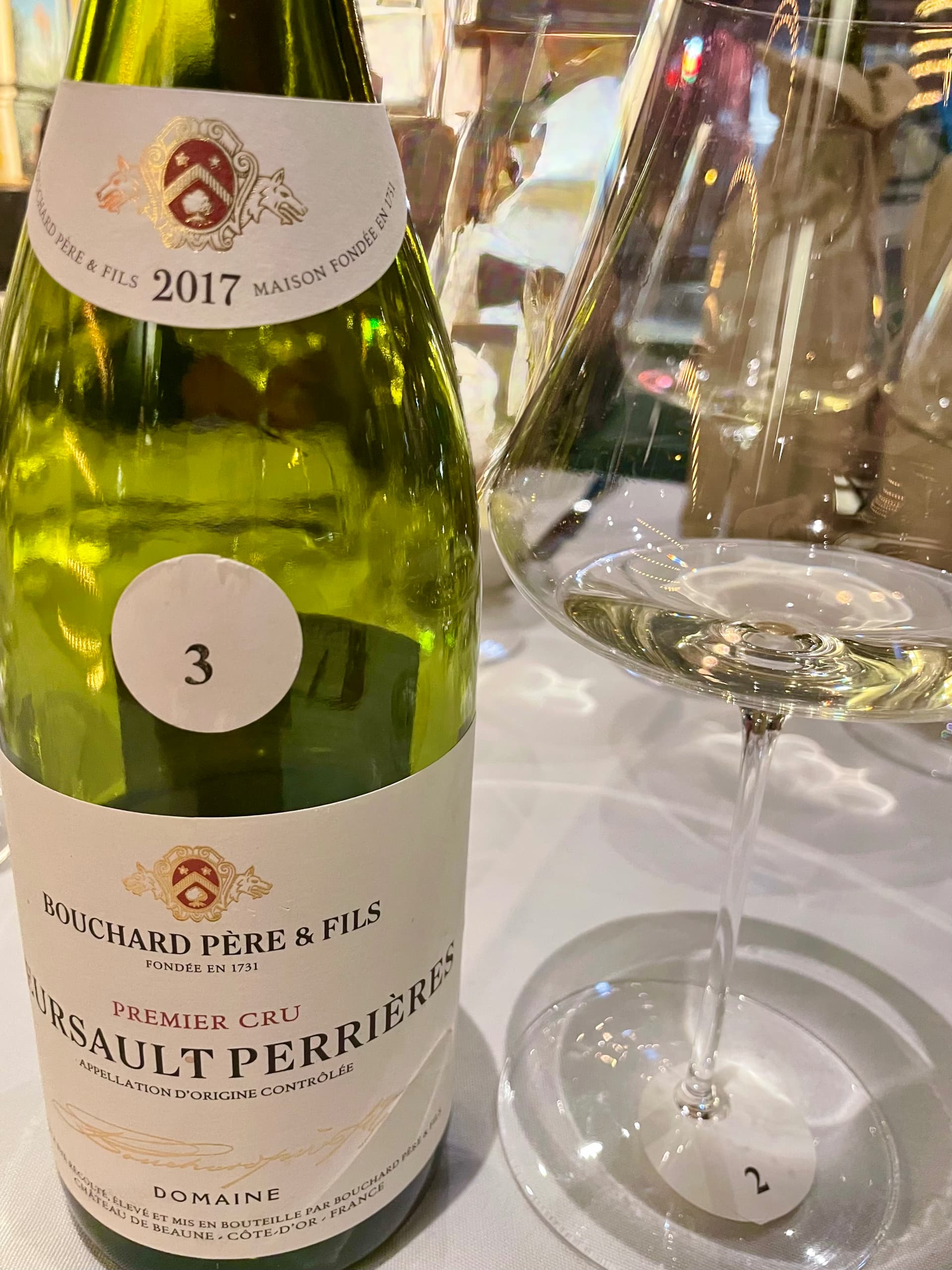 2} 2017 DOMAINE BOUCHARD MEURSAULT-PERRIERES 1er Cru- white Burgundy blind; following its light yellow color came mild aromas of honey, butter and coffee laden yellow apple with a sprinkle of cinnamon, all of which continued on in the flavor profile; it had lovely soft, smooth mouthfeel, was in ideal balance and IMHO, a fabulous wine that I ranked 3rd in the flight and the group voted it #5. The fruit is sourced from 1.2 hectares of vine.