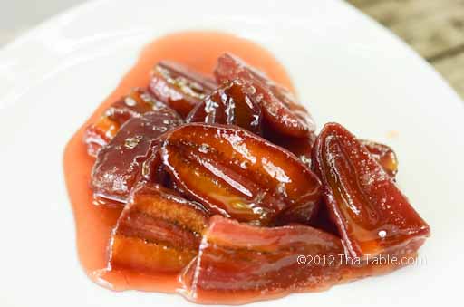 We attended a Thai cooking class while in Bangkok last week and one of the surprising to me ingredients was limestone (or lime) water. It’s made by soaking lime putty in water and apparently makes pastry crispier and helps fruit keep its shape when cooked.